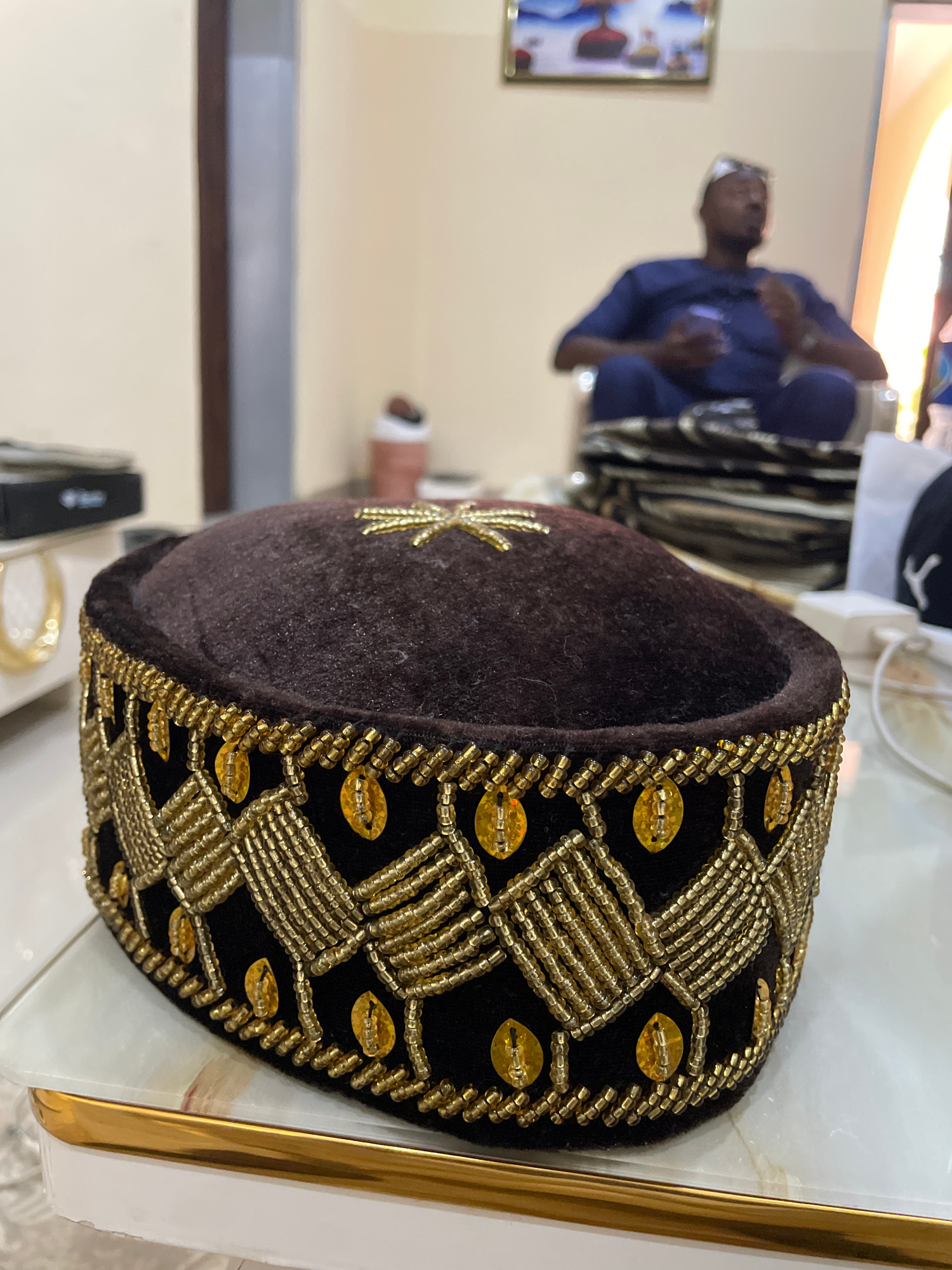 A traditional Nigerian hat, known as a fila, sits on a surface. The fila is brown with intricate gold beaded embroidery. In the blurred background, a man wearing a blue shirt stands in what appears toβ¦read more