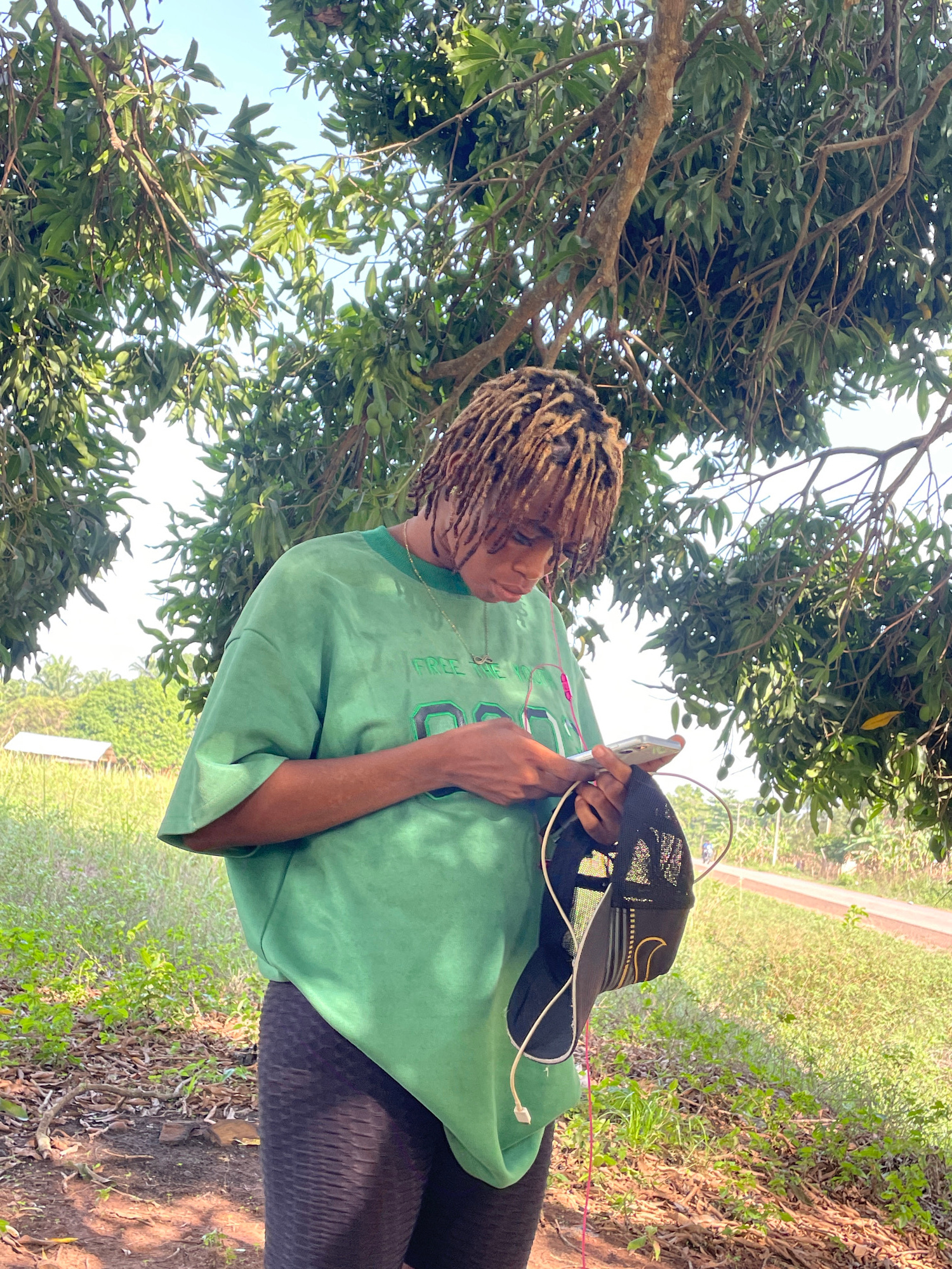 A person with light brown dreadlocks is standing outdoors in what appears to be a grassy area with trees. The person is wearing a loose-fitting, light green t-shirt, black leggings, and a gold chain a…read more