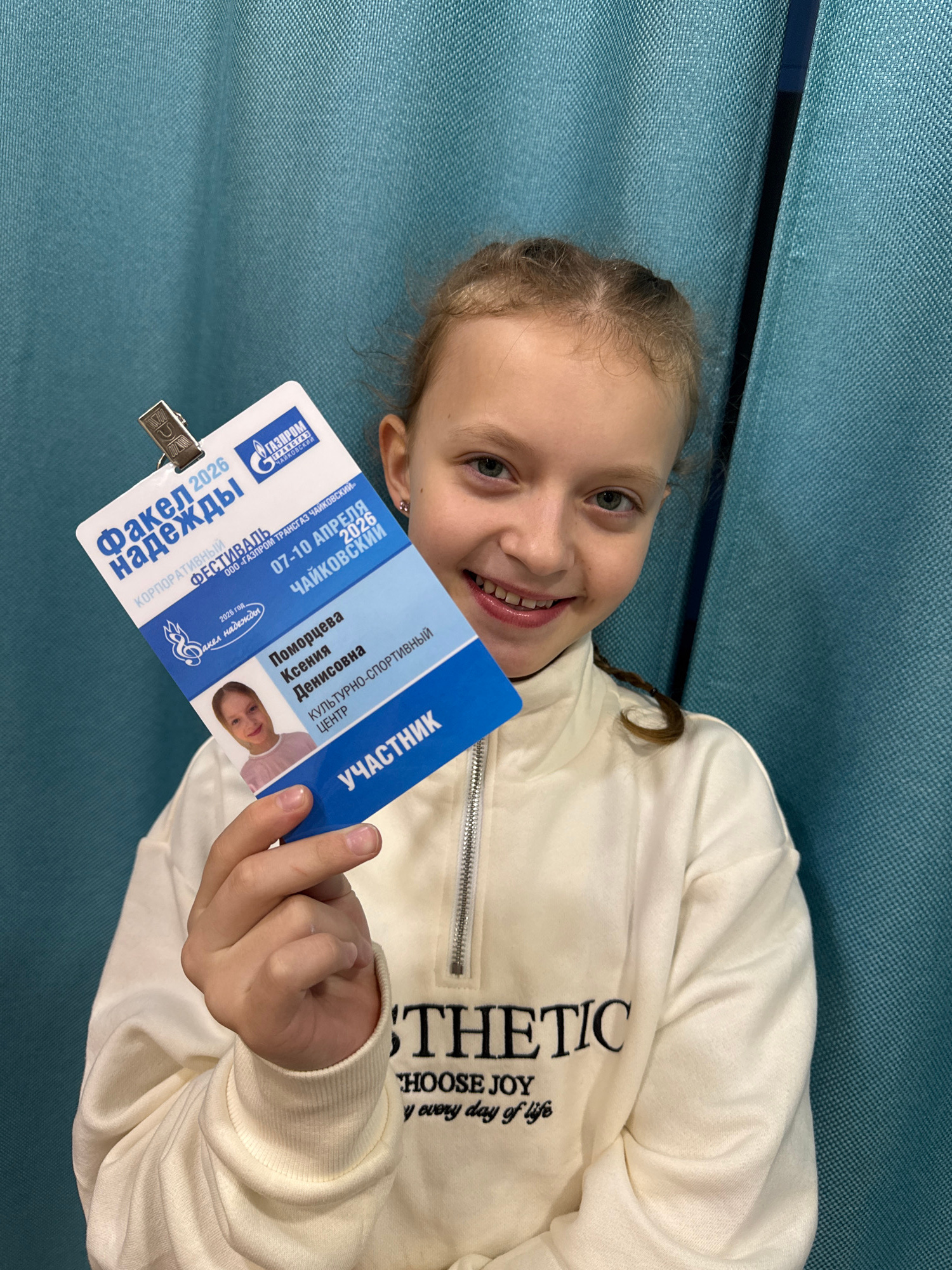 A young girl is holding up her participant badge for the 2026 Fakel Nadezhdy (Torch of Hope) corporate festival in Chaikovsky, Russia. The festival, sponsored by Gazprom Transgaz Chaikovsky, is a cult…read more