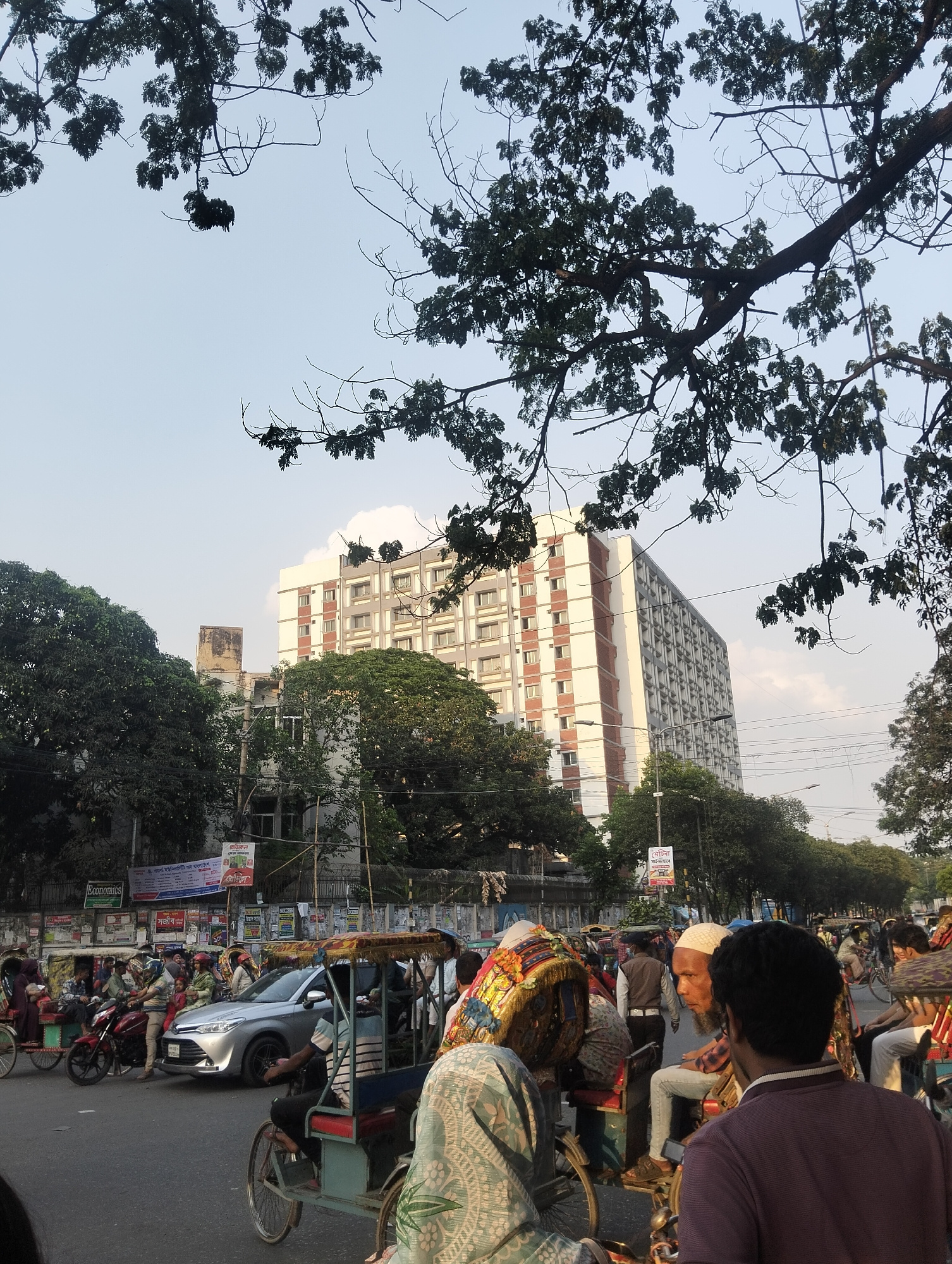 The image depicts a busy street scene in Dhaka, Bangladesh. Numerous rickshaws, motorcycles, and a silver sedan are visible amid pedestrians. A tall, rectangular building with a white and grey facade,…read more