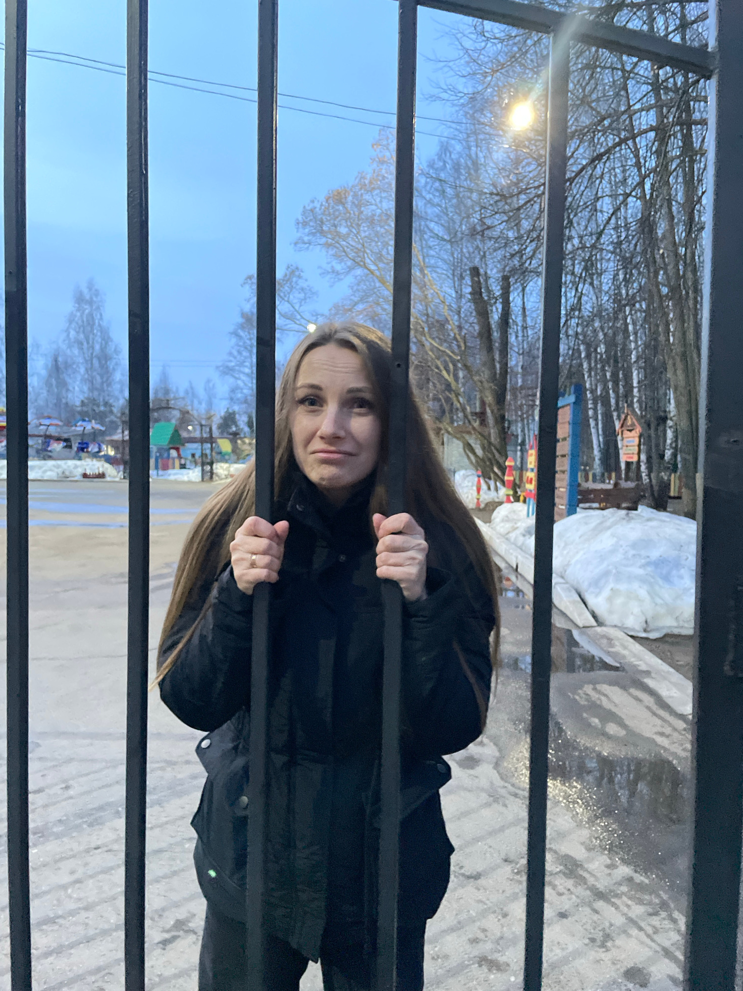 A medium shot shows a Caucasian woman standing behind a dark metal fence, looking toward the viewer. She is wearing a dark jacket and has long, light-brown hair. Her hands grip the fence. Through the…read more