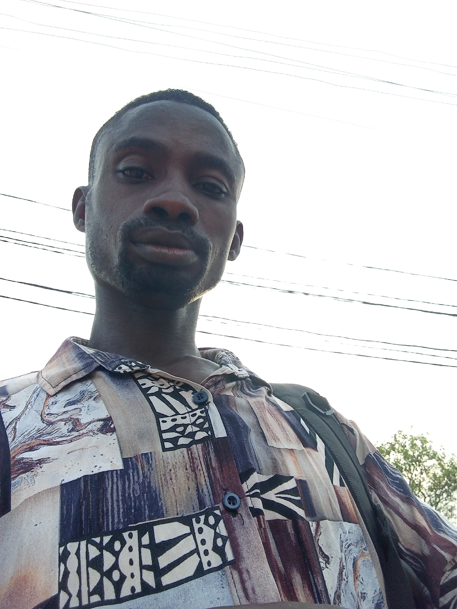 A man is standing outdoors, looking directly at the camera. He has dark skin, a close-cropped haircut, and a short beard. He is wearing a patterned button-down shirt. A black strap, possibly from a ba…read more