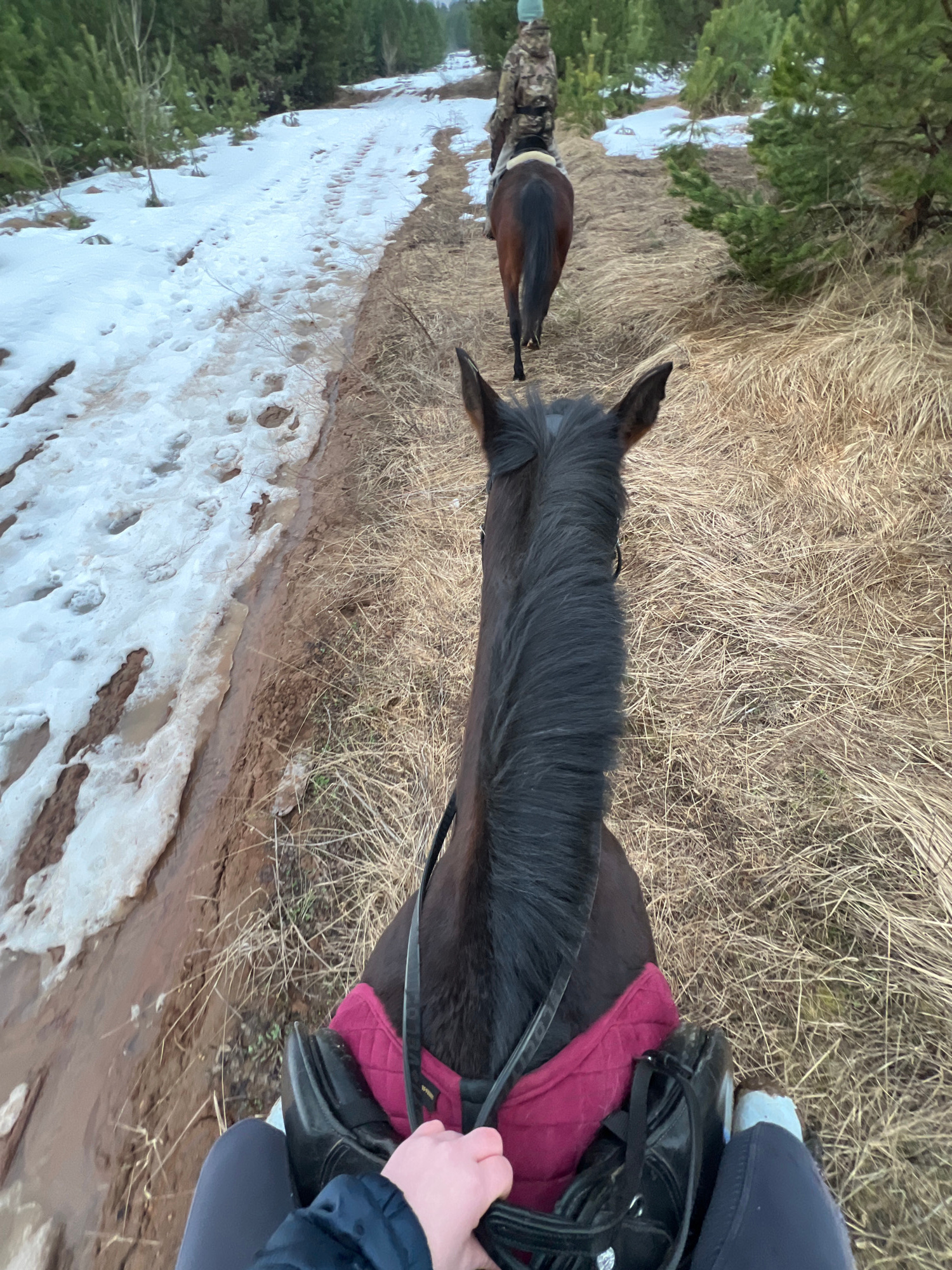 From an elevated perspective, the image shows two horses on a trail in a snowy, partially thawed environment. The primary subject is a dark-colored horse, viewed from behind the rider, with a black ma…read more