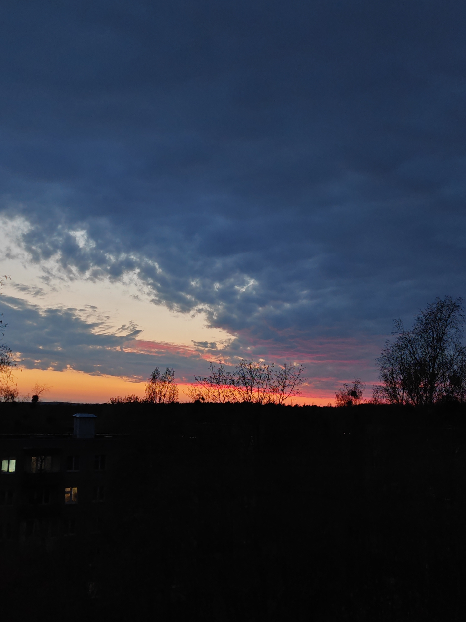 The image depicts a twilight or sunset scene over a landscape in Hrodna, Belarus, characterized by dramatic natural lighting and strong silhouettes. The upper portion of the sky is dominated by heavy,…read more