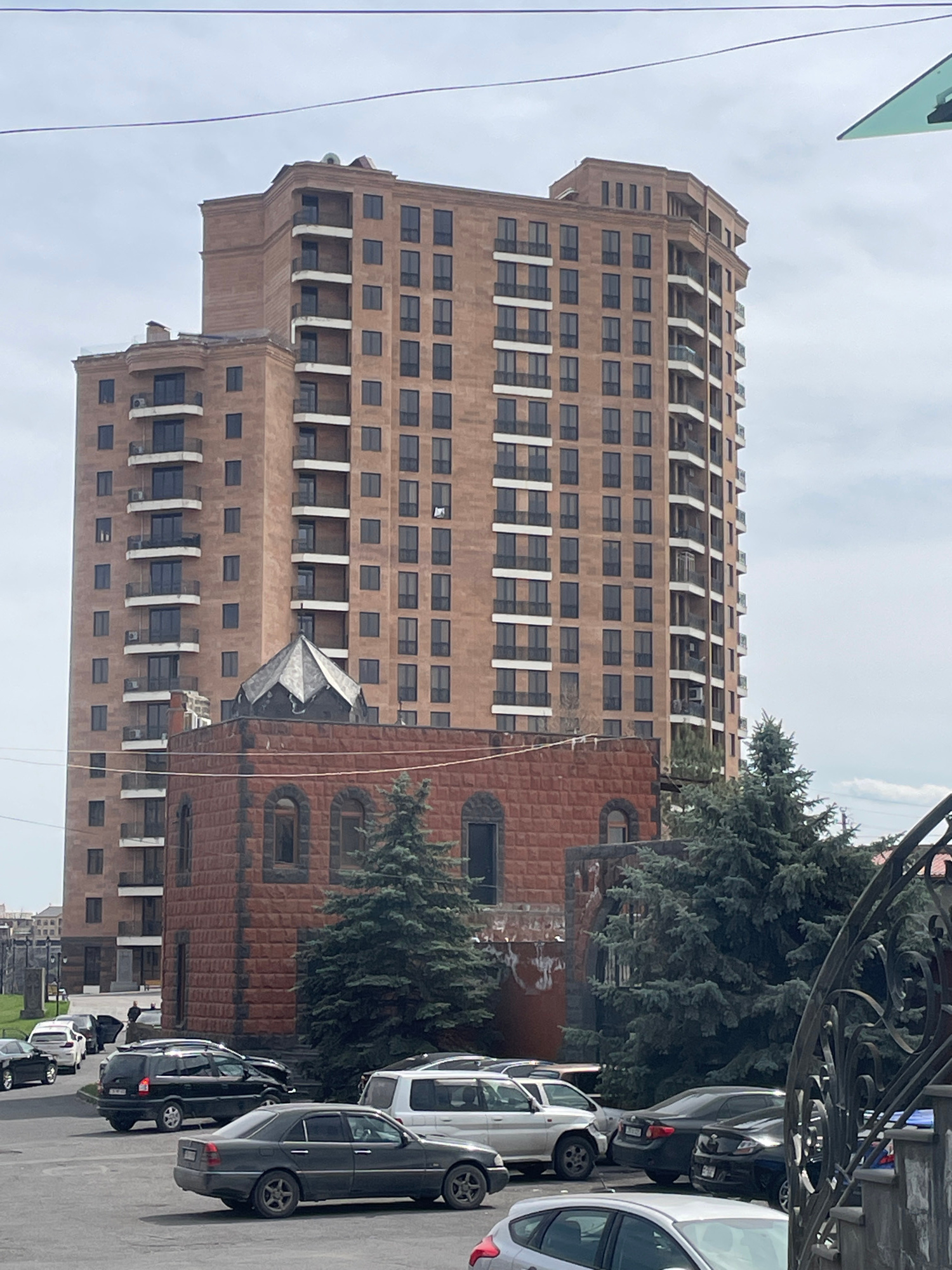 The image shows a tall, brown, multi-story building in Yerevan, Armenia. The building has many windows and white balconies. To the right of the tall building is a smaller building made of red brick. S…read more