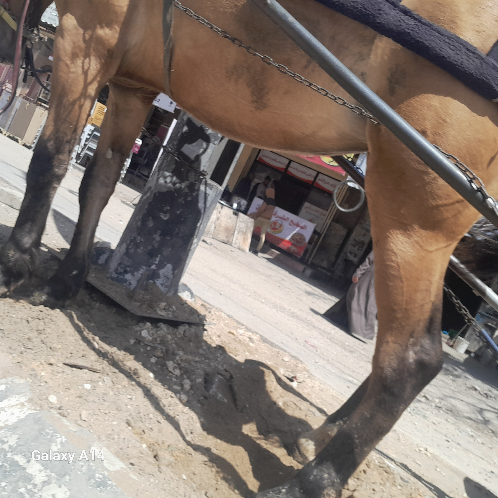 The image shows the lower portion of a harnessed brown horse standing on a paved street in Nuseirat, Palestinian Territory. The horse's legs are dark brown at the hooves, fading to a lighter brown col…read more