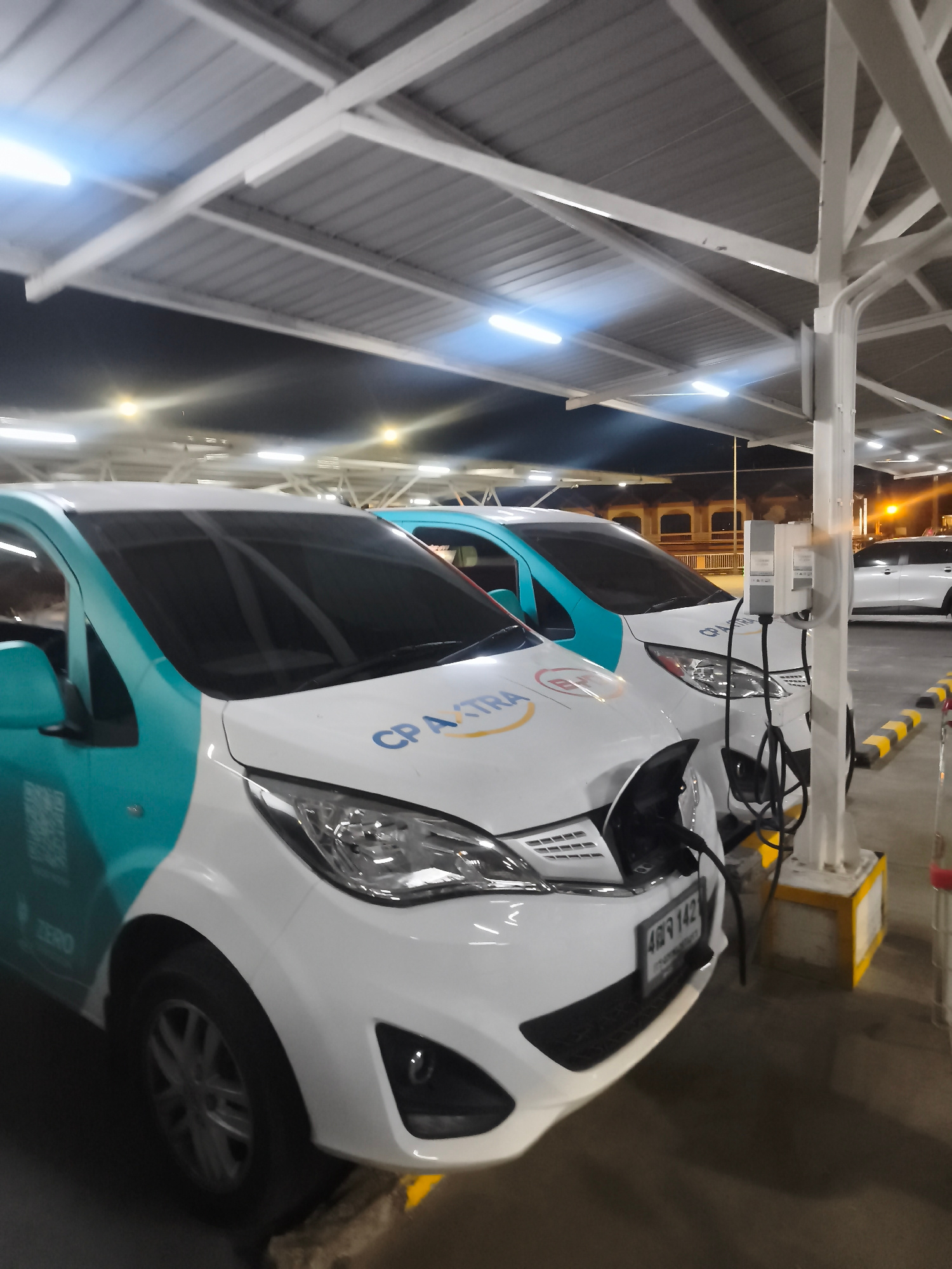 Two electric vehicles, white with turquoise accents, are parked at charging stations under a covered structure. "CP ASTRA" is visible on the side of one vehicle, which is plugged into a charging station. The license plate of the closest vehicle reads "4จช 142". The location appears to be a parking garage with overhead lighting. Baan Bo Phut, Thailand is not discernible. | Open Wire