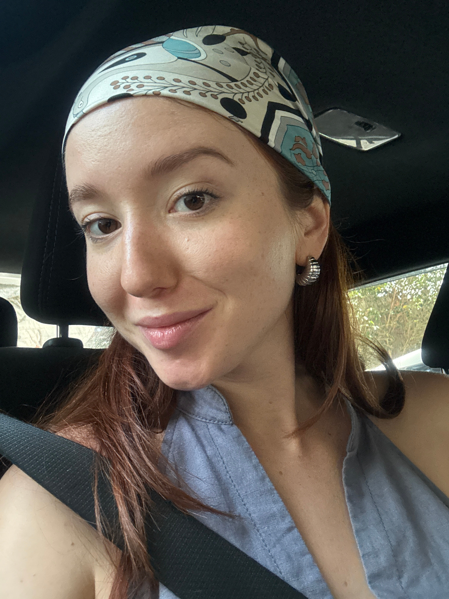 A person with reddish-brown hair, wearing a patterned headscarf and a light grey shirt, is sitting in a car. They are wearing a seatbelt and an earring. The location is inside a vehicle, not identifia…read more