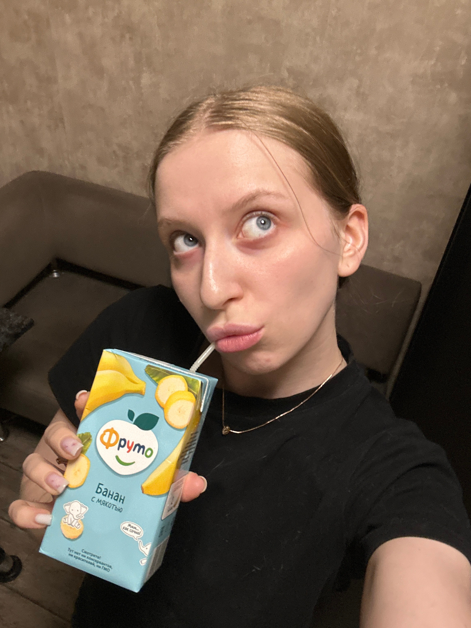 A young woman is drinking from a box of Fruto brand banana juice with a straw. The juice box is blue and features images of bananas, apples, and a cartoon elephant. The woman has blonde hair and blue…read more