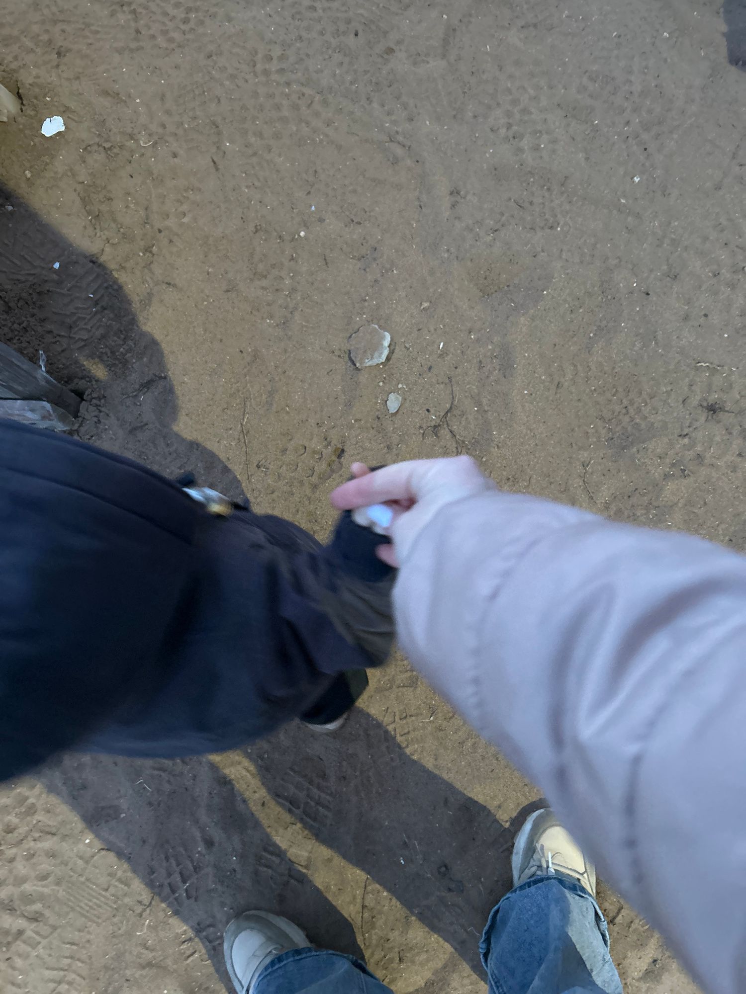 The image presents a top-down view of two individuals standing on a dirt surface in Noviy, Russia. The ground is uneven, marked with tire tracks or boot prints, and scattered with small pebbles and wh…read more