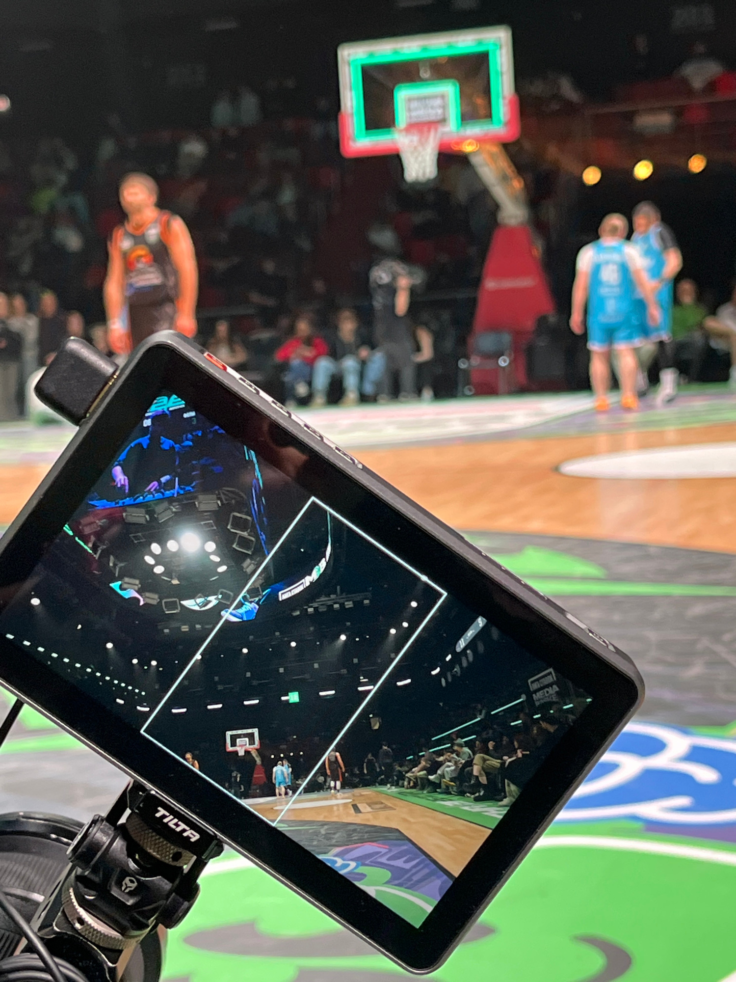 A slightly blurred, indirect view of a basketball game is seen through a monitor attached to a Tilta rig. The monitor display shows a brightly lit indoor arena with a basketball court marked with a wh…read more