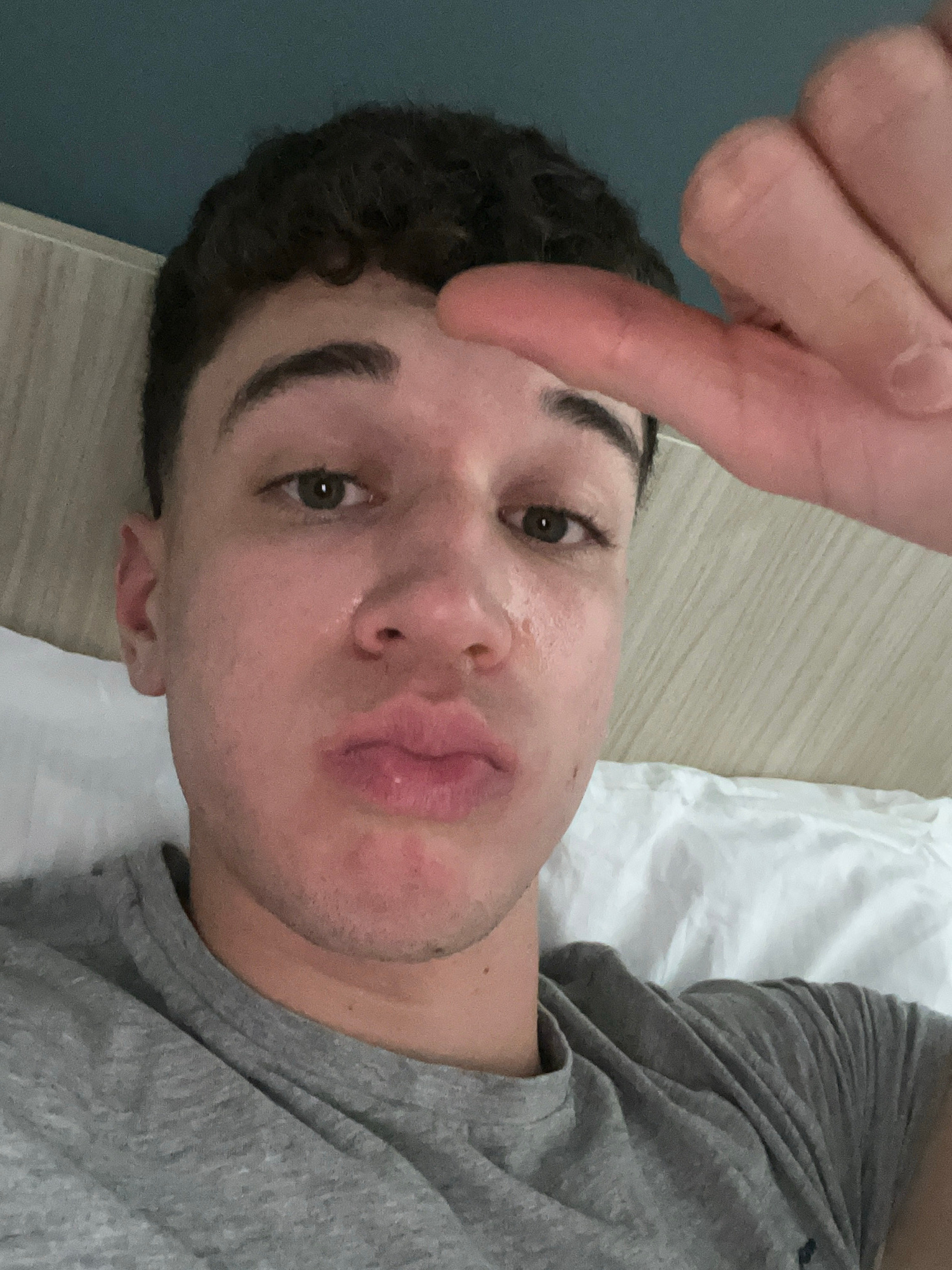 A close-up, selfie-style photograph shows a light-skinned person with dark, curly hair and dark eyebrows lying down on a bed or similar surface covered with a white sheet. The person is wearing a gray…read more