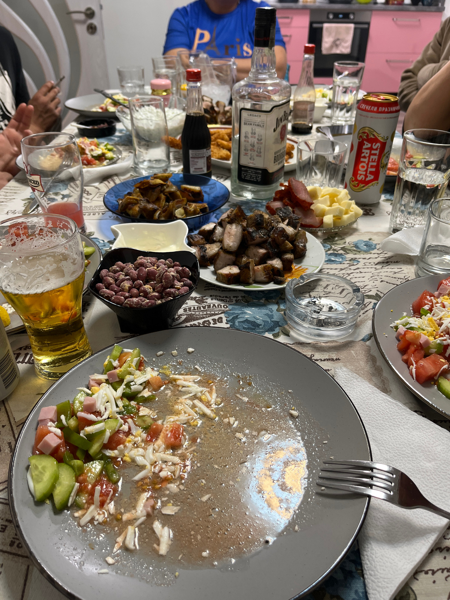 The scene is a close-up shot of a table laden with food and drinks, likely a shared meal in progress. Dishes include salad, grilled meat, cheese cubes, and a bowl of what appears to be beans. Beverage…read more