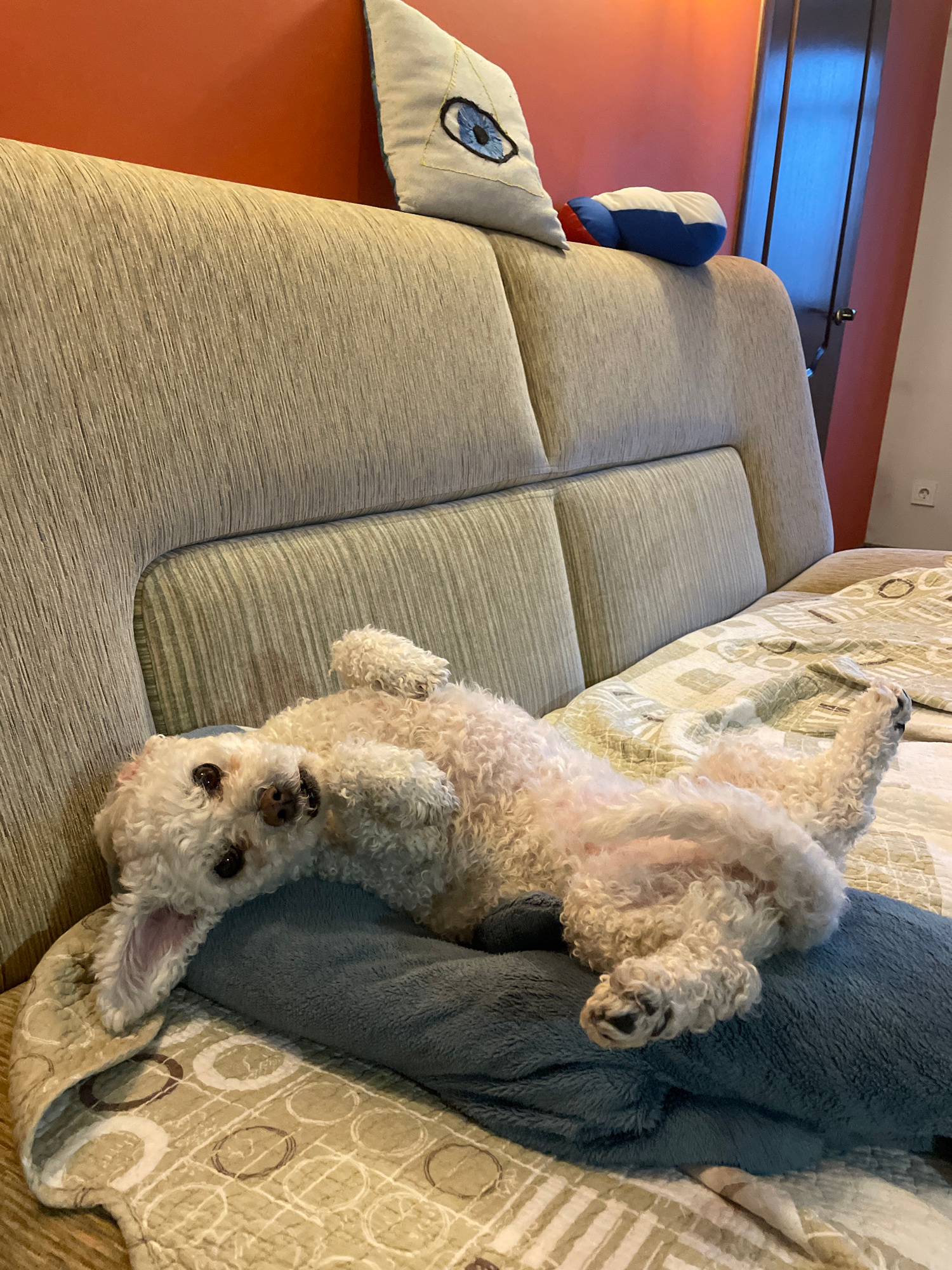 A small, white poodle-like dog is lying on its back on a beige couch with a blue pillow. The dog is facing the camera. A pillow with a stitched blue eye and a stuffed toy are visible on the left side…read more