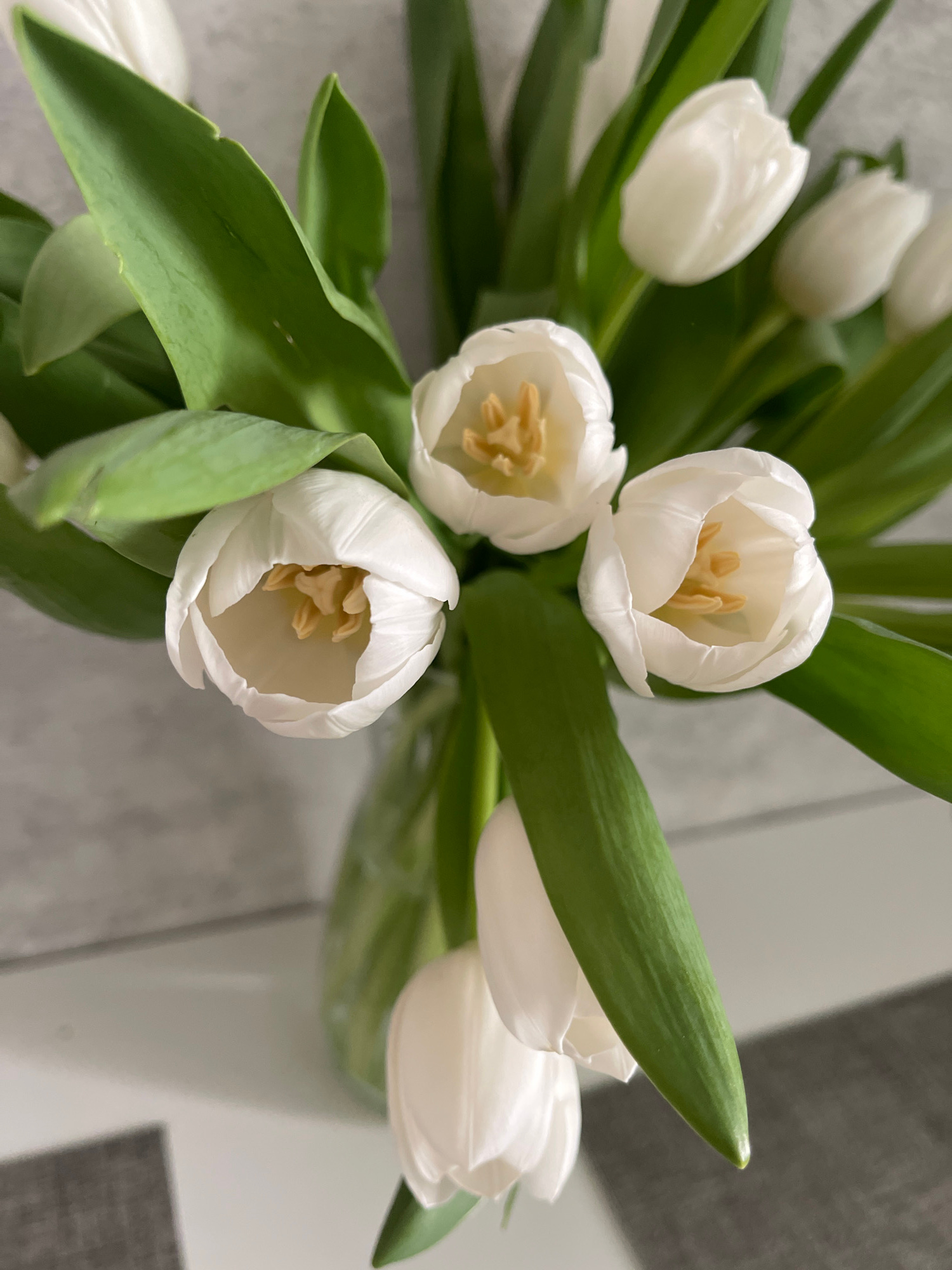 A close-up, eye-level shot depicts a bouquet of white tulips with green leaves arranged in a clear vase on a table. The flowers are in various stages of opening, with some displaying their yellow cent…read more