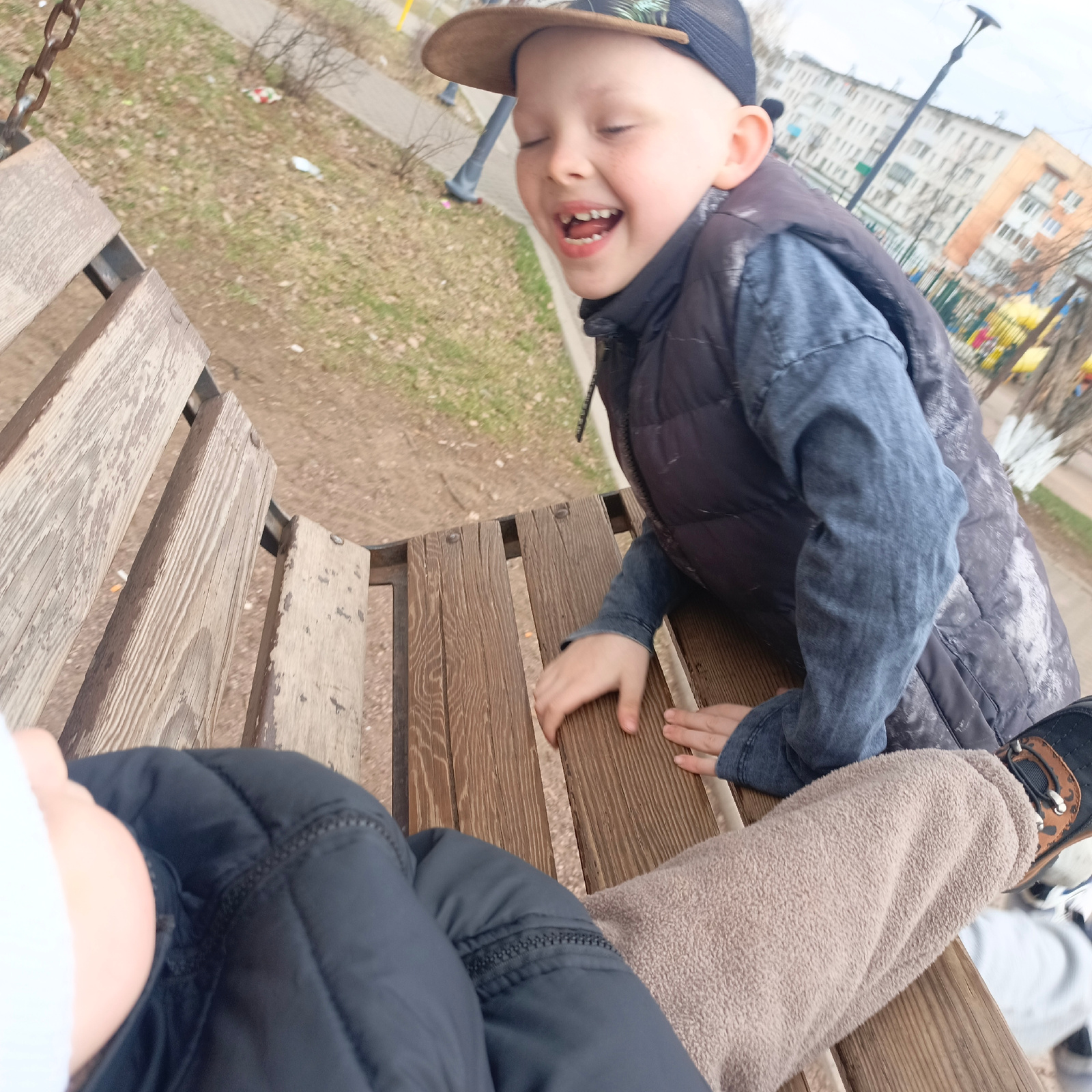 The image depicts a child wearing a baseball cap, a vest, and a blue shirt, laughing and leaning against a wooden bench. Another child, primarily visible by their head and upper body, is also seated o…read more