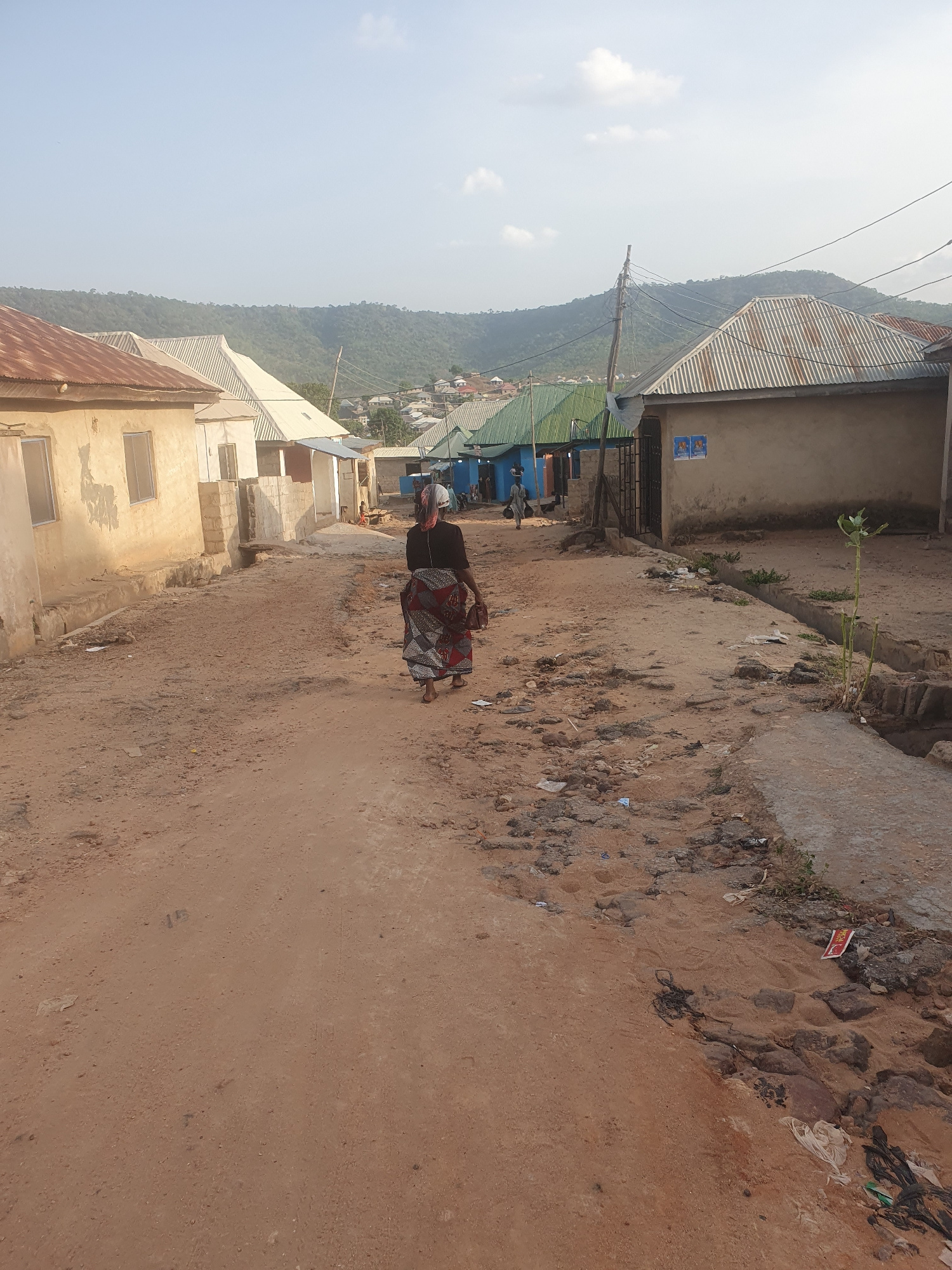 The image depicts a dirt road winding through what appears to be a residential area in Lokoja, Nigeria. The houses lining the road are a mix of single-story structures, some with corrugated metal roof…read more