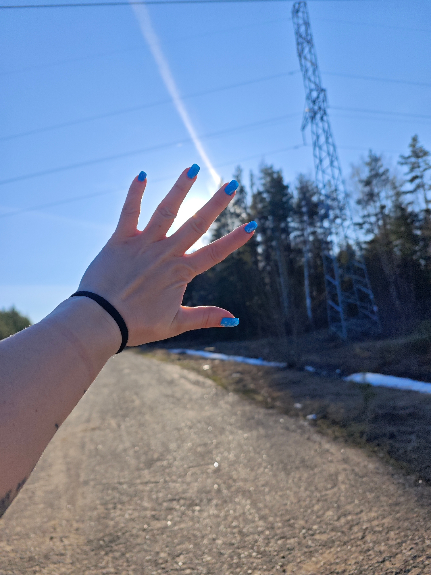 The image presents an outdoor scene in Chaikovsky, Russia, captured under bright daylight with a clear blue sky. In the foreground, a person's right hand and forearm are prominently featured, with theβ¦read more