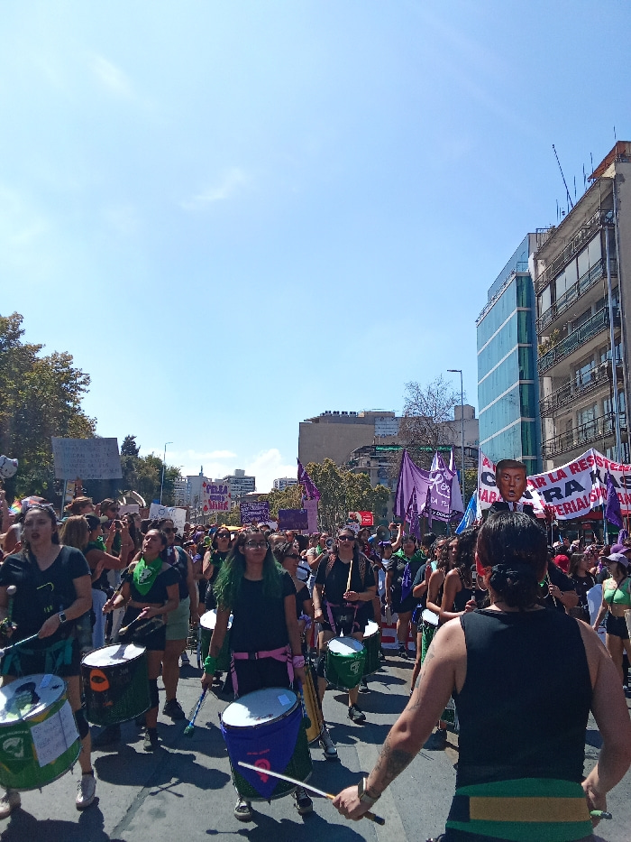 The image depicts a daytime street demonstration in Santiago, Chile, under a clear blue sky with minimal cloud cover. A large procession of individuals, predominantly women, occupies the width of a mu…read more