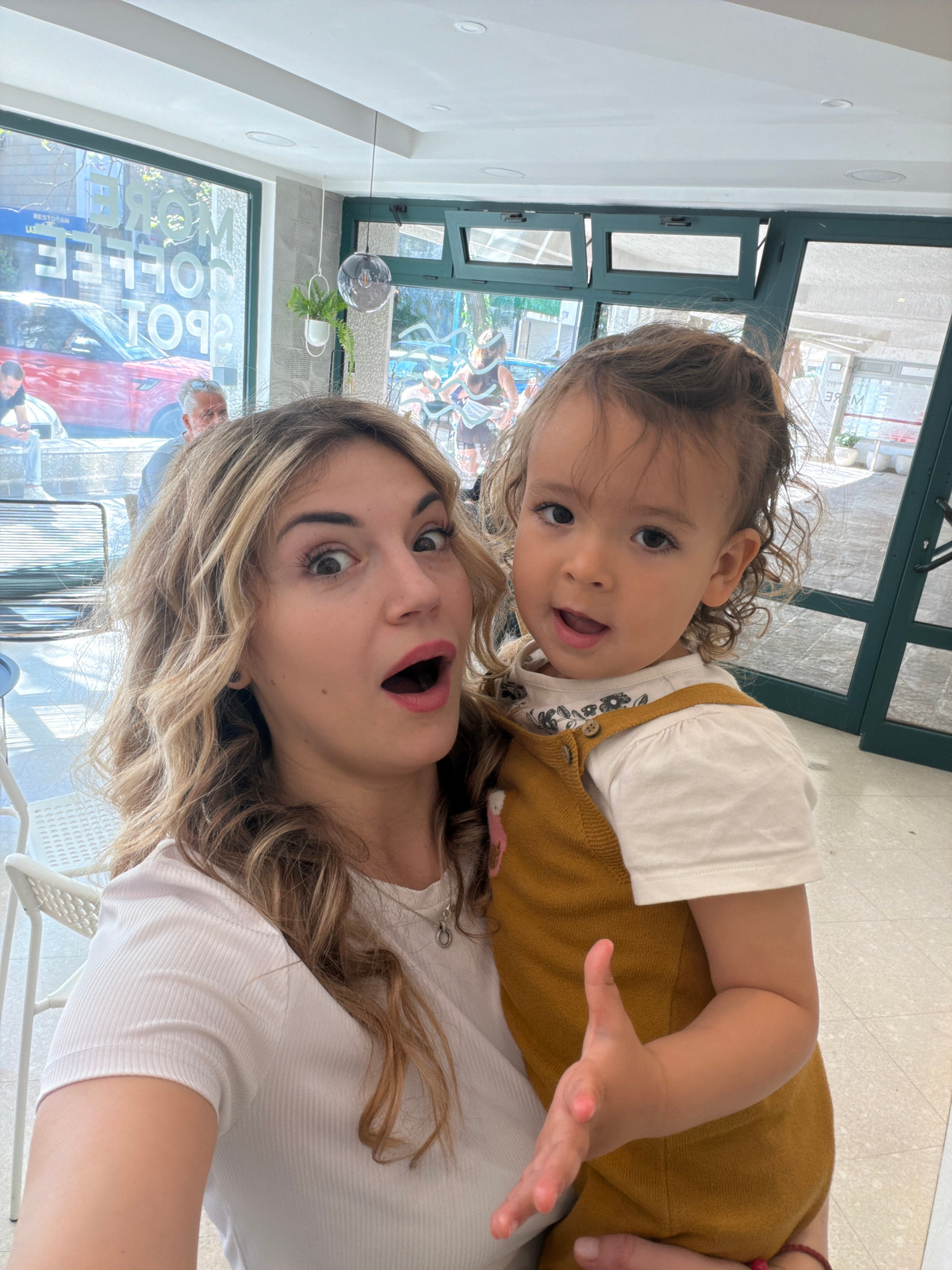 A light-skinned woman and a toddler are in a possible cafe in Budva, Montenegro. The woman has blonde hair and is wearing a white shirt. She has an open mouth as if posing for the camera. The child ha…read more