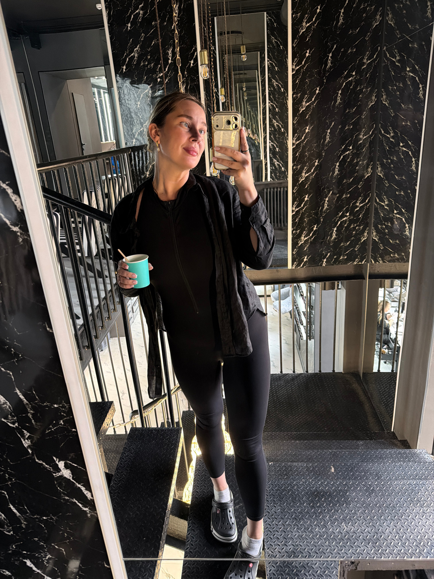 The image shows a reflection of a woman taking a selfie in a mirrored staircase or elevator interior. The walls are decorated with black marble patterned panels separated by white horizontal lines. Thβ¦read more