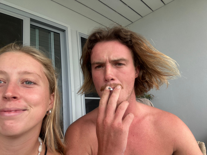 This image captures two individuals, a female and a male, in a close-up, possibly selfie-style, frame. The scene is an outdoor or semi-outdoor area, potentially a balcony or patio, located in Bulli, A…read more