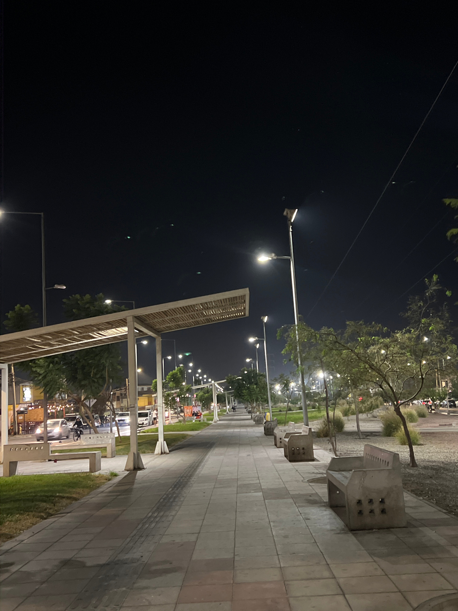 The image captures a nighttime scene along a pedestrian walkway in Arica, Chile. The walkway, composed of gray concrete tiles, stretches into the distance, lined with modern concrete benches that feat…read more