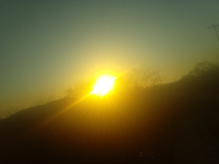 The image depicts an outdoor landscape scene, likely in the vicinity of Juan Griego, Venezuela, during either sunrise or sunset. A brilliant, intense yellow-orange sun, emanating distinct rays, is positioned in the lower-left to mid-left quadrant of the frame. The sky transitions from a light teal-blue at the top to a vibrant golden hue surrounding the sun, indicative of atmospheric conditions at dawn or dusk. A prominent dark, silhouetted landmass, consistent with a hill or elevated terrain, occupies the lower and mid-right portions of the image, obscuring the horizon. Sparse, dark, possibly deciduous vegetation, appearing as small trees or bushes, is discernible along the crest and upper slopes of this silhouetted landmass, particularly to the right of the sun. A single dark, vertical utility pole or similar structural element is visible on the far right edge of the frame, extending upward from the landmass into the golden sky. No individuals, specific actions, or interactions are present. The environment appears natural, characterized by a bright light source and atmospheric haze. | Open Wire
