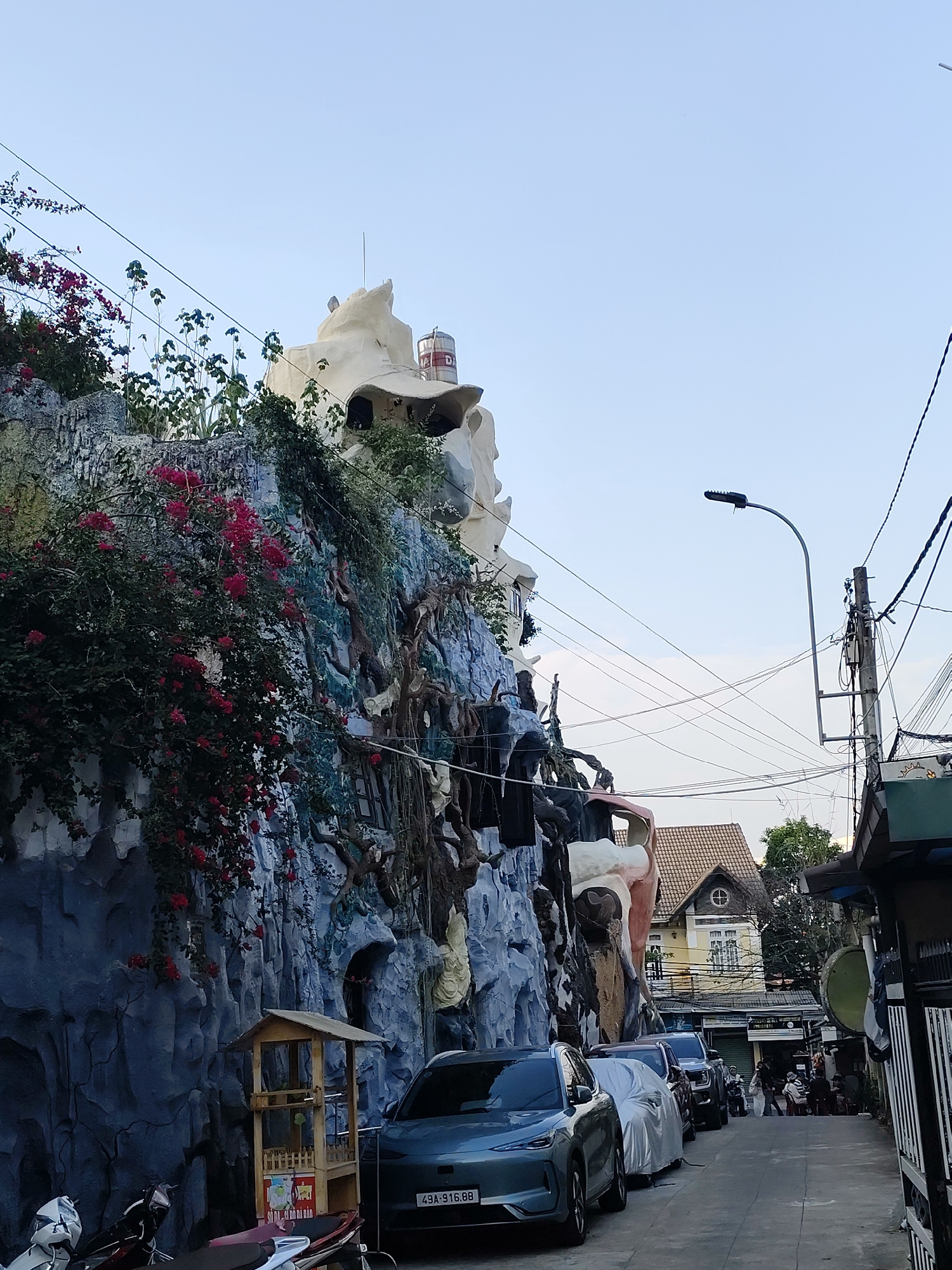 The image depicts a street in Da Lat, Vietnam, featuring the "Crazy House" (Hang Nga guesthouse) prominent on the left. The unique architecture of the building mimics natural forms, with its sculpted…read more