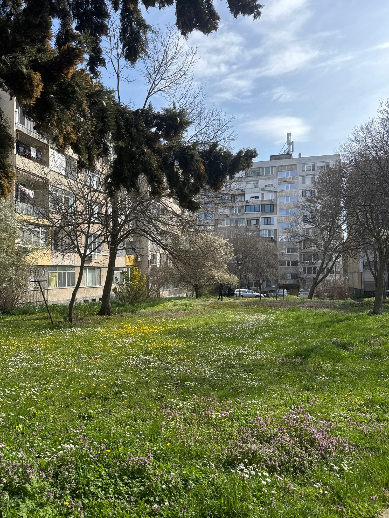 The image depicts a residential area in Burgas, Bulgaria. Two large apartment buildings dominate the background, constructed in a utilitarian, Soviet-era style with multiple identical windows and balc…read more