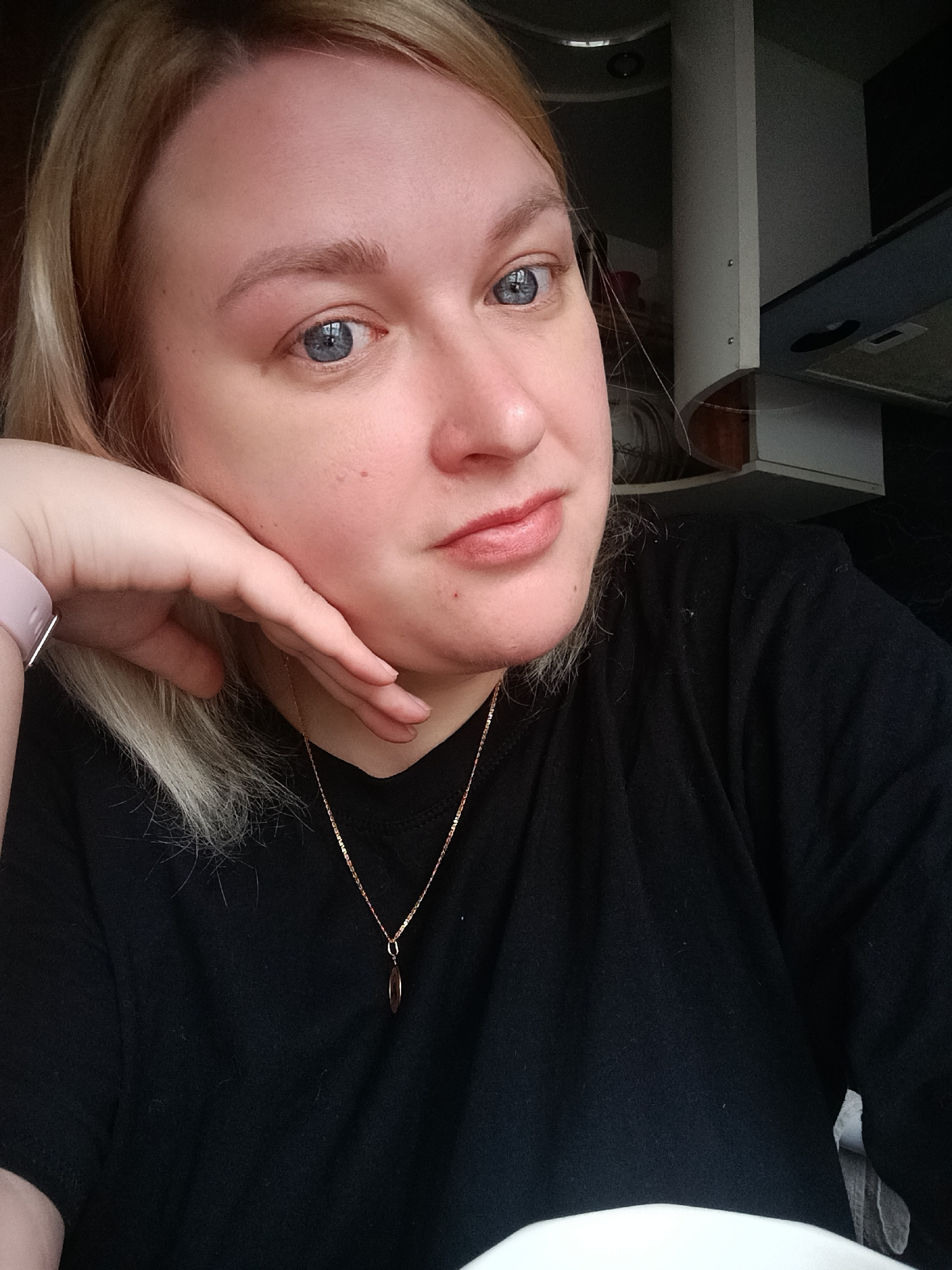 A close-up, chest-up portrait shows a woman with blonde hair and striking blue eyes, captured indoors in Chaikovsky, Russia. She appears to be in her 20s or 30s, with a fair complexion. Her blonde hai…read more