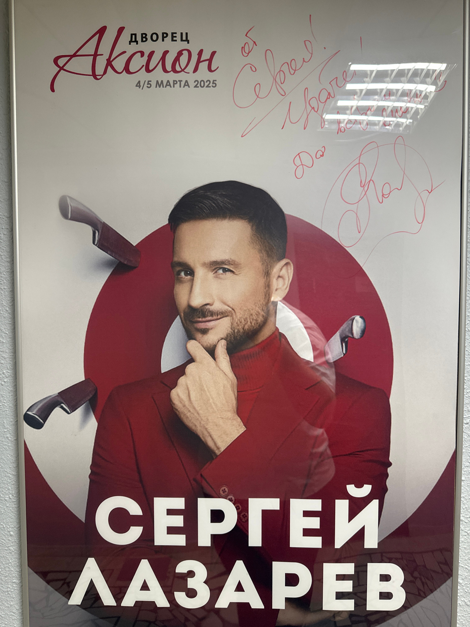 The image shows a framed poster for Sergey Lazarev, a Russian singer, with the text "Дворец Акcion" and "4/5 марта 2025" indicating a performance date. The poster features a man in a red suit, presuma…read more