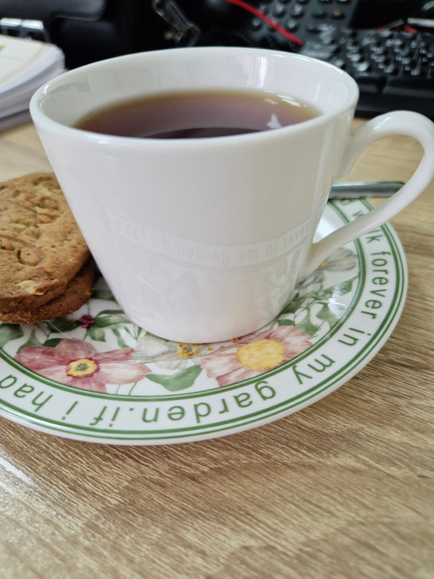 A white teacup, partially filled with a light brown liquid, sits on a saucer with a floral design and a green rim that reads, "walk forever in my garden if I had". A cookie rests partially under the t…read more