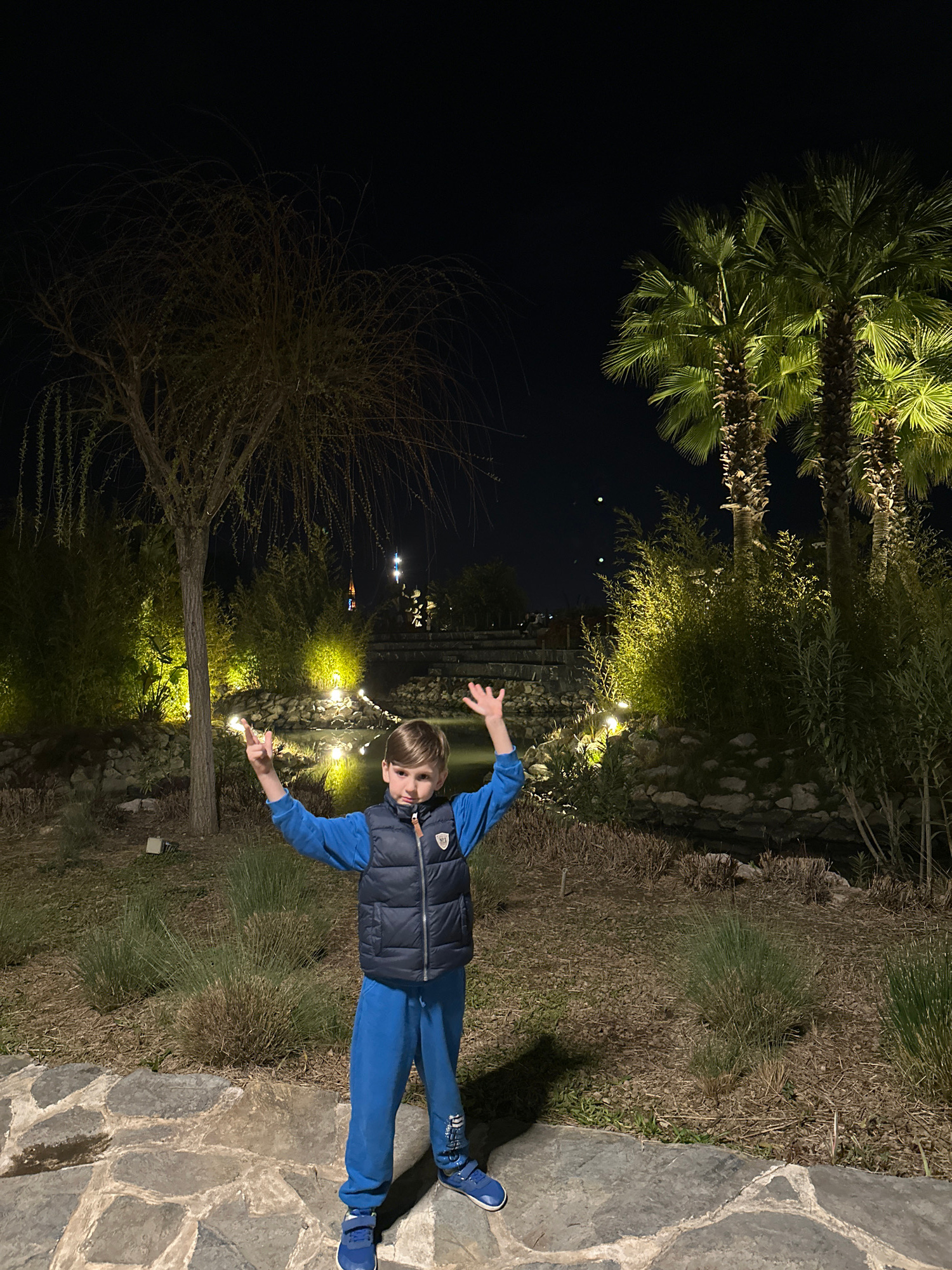 A young boy stands centered in a landscaped park at night in Fethiye, Turkey, specifically within Şehit Fethi Bey Parkı. The boy, approximately 7-10 years old with light brown hair, faces the camera w…read more