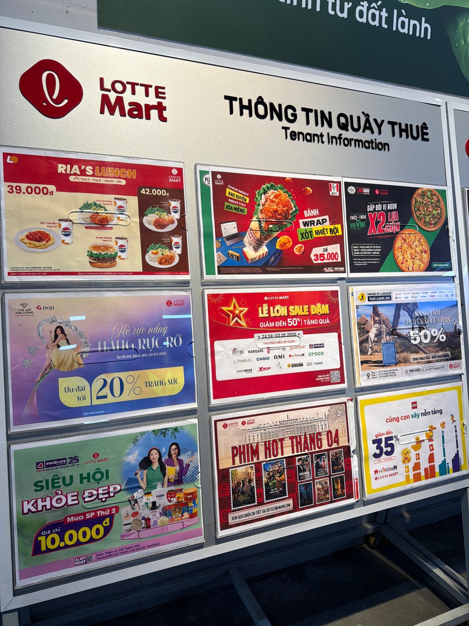 The image shows a display case with various advertisements for Lotte Mart, a South Korean retail chain, likely located in Đà Nẵng, Vietnam. The ads promote sales and promotions from various brands and…read more