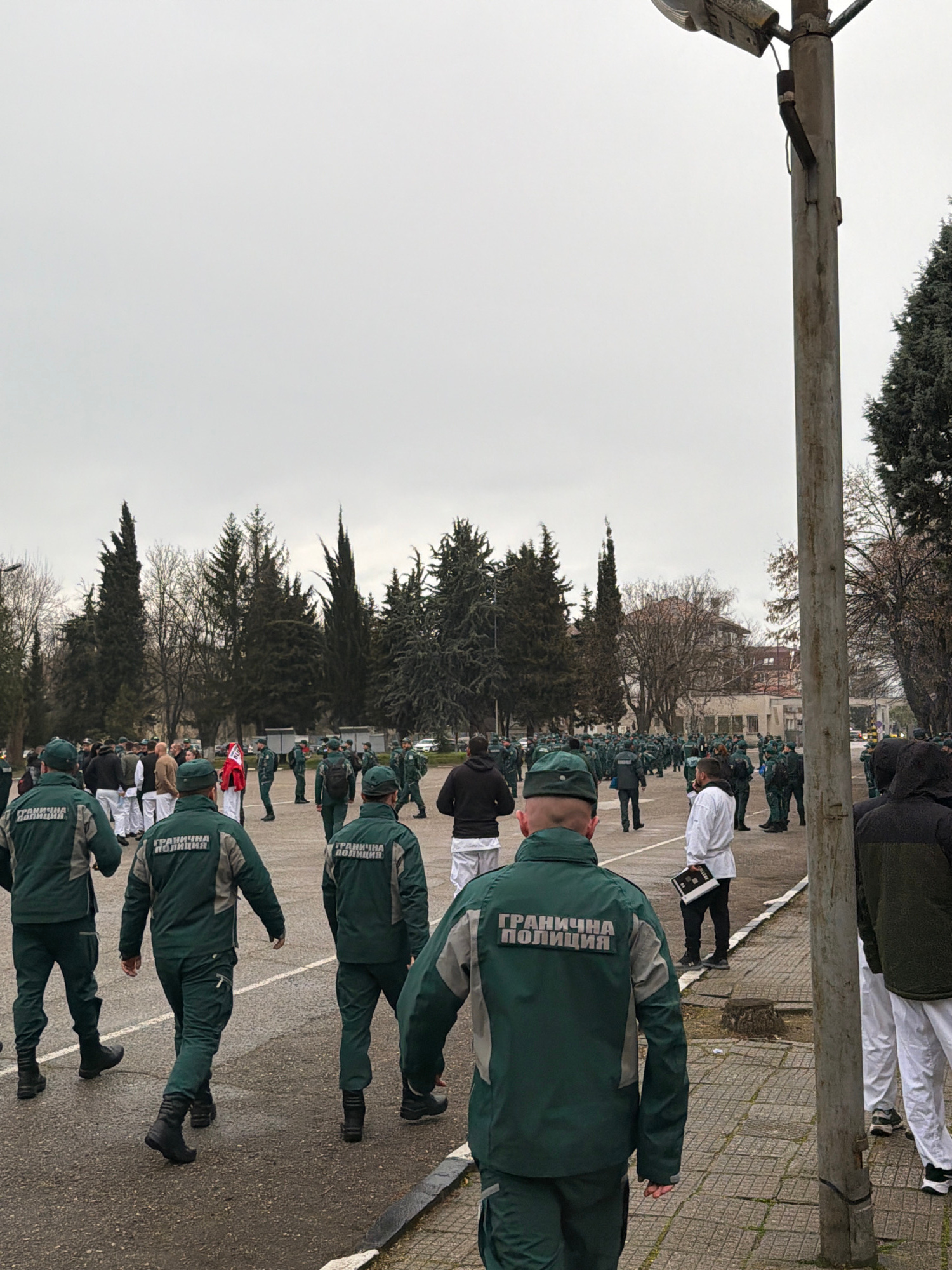 The image depicts a formation of individuals in green military-style uniforms. A patch on their backs reads "ГРАНИЧНА ПОЛИЦИЯ" which translates to "Border Police". The individuals are lined up on a p…read more