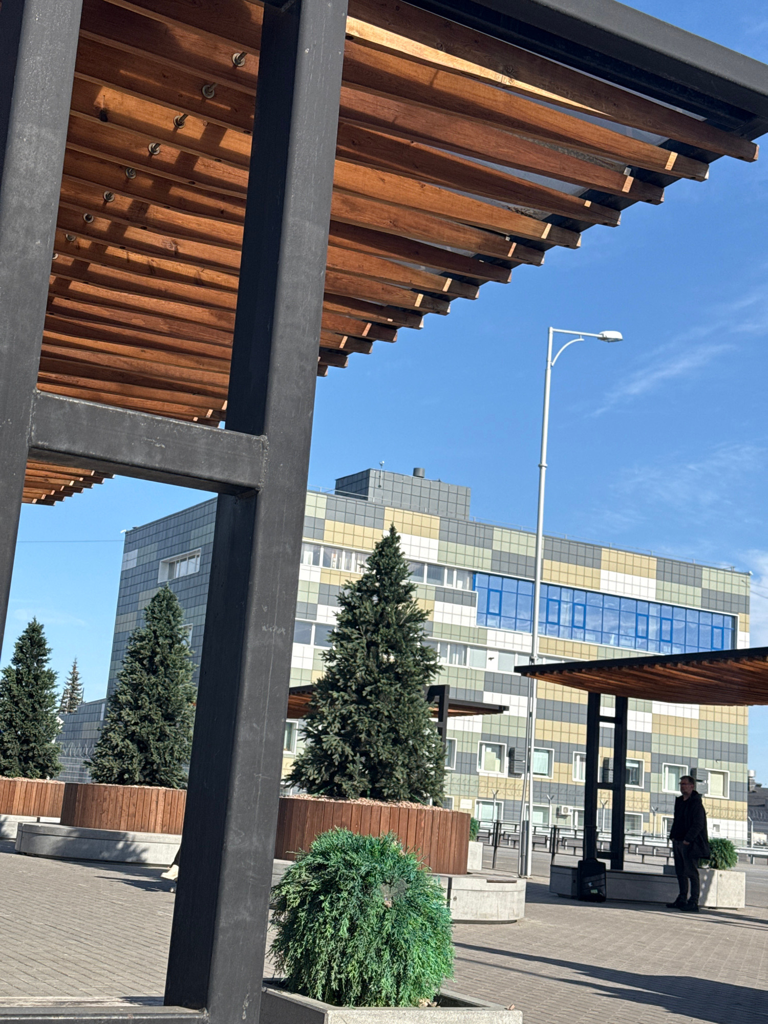 A ground-level, tilted shot looks up at a streetscape in Ufa, Russia. The foreground is dominated by sections of a dark metal framework with parallel wooden slats attached, obscuring parts of the view…read more