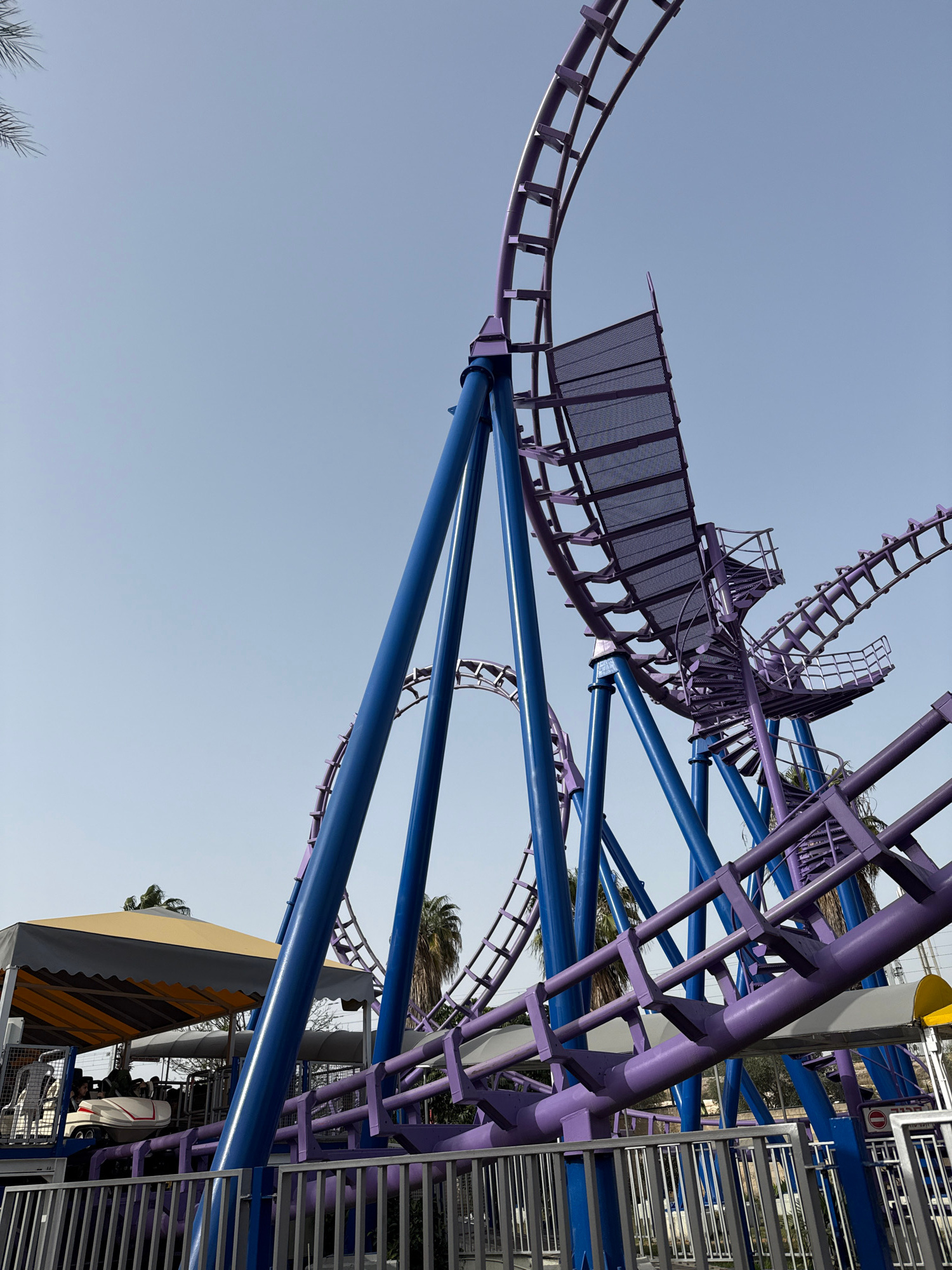 The image displays a vibrant purple and blue roller coaster structure against a clear, bright blue sky. The roller coaster tracks are a distinct purple, while the support pillars are bright blue. The…read more