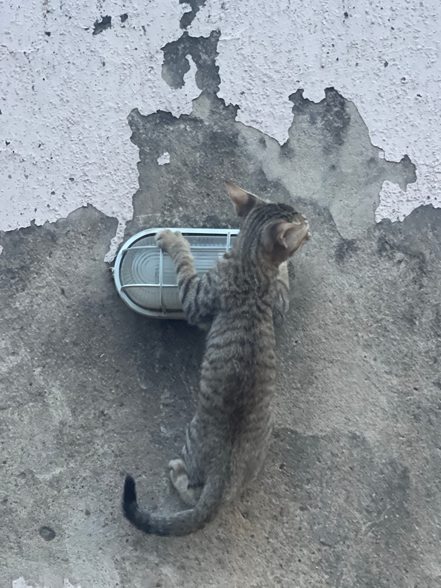 A tabby kitten is climbing on a wall-mounted, caged light fixture against a mottled gray and white wall. The location is not explicitly stated as Lokoja, Nigeria in the image.