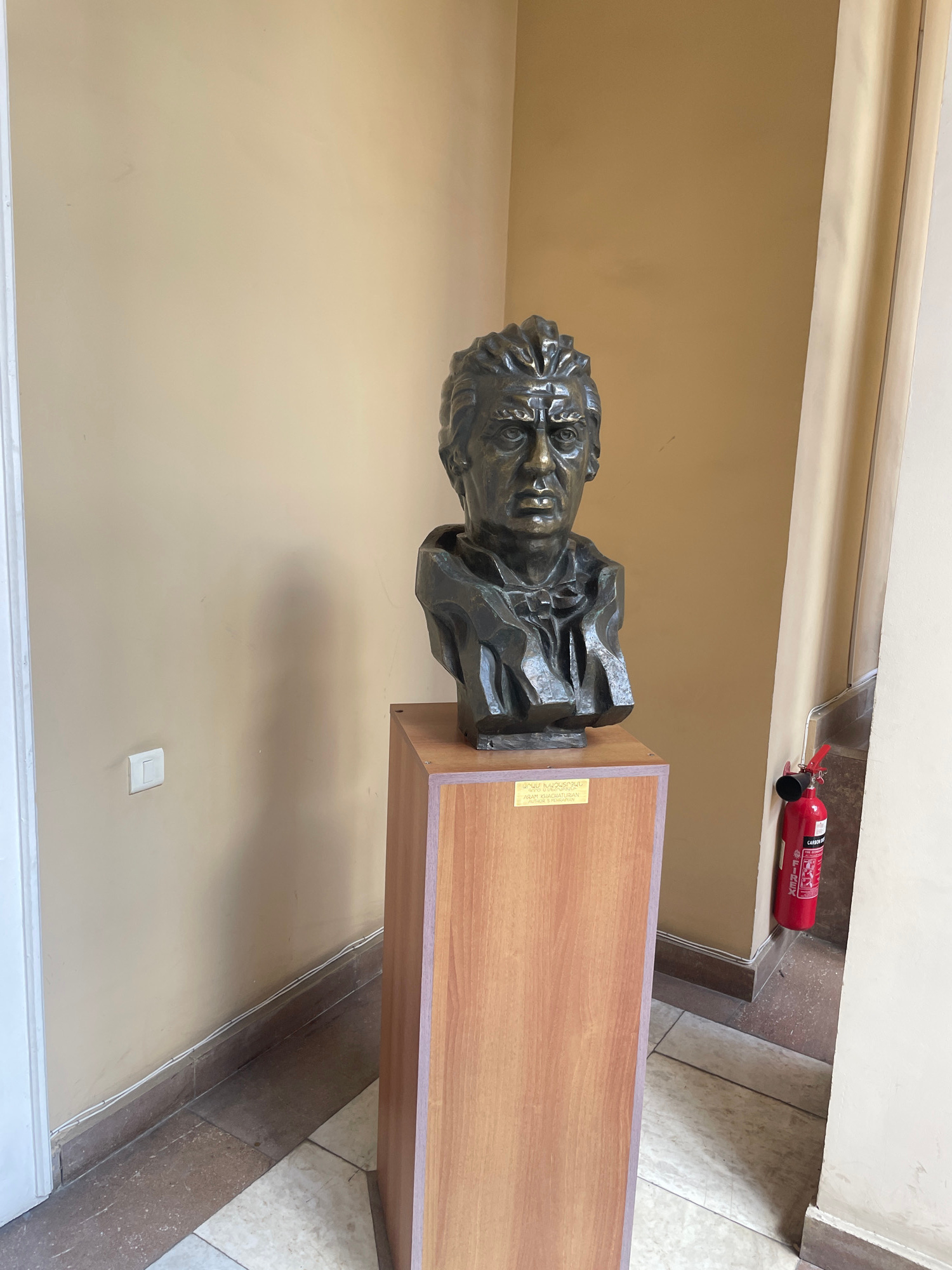 The image shows a bust of Komitas Vardapet, an Armenian priest, musicologist, composer, arranger, singer, and music pedagogue, in a public setting. The bust is made of dark metal and is mounted on a w…read more