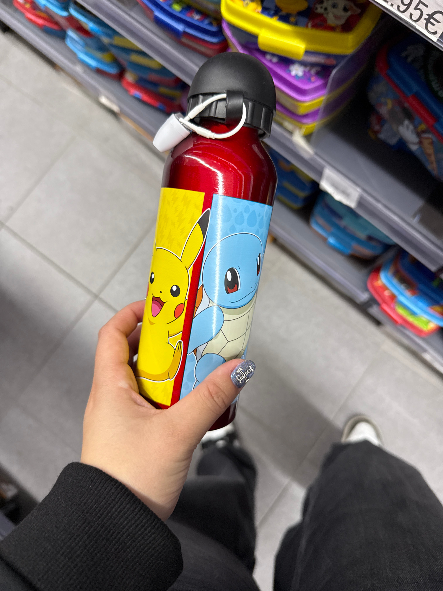 A hand holds a red and yellow water bottle, featuring images of Pikachu and Squirtle from Pokémon, in an aisle of a store. The aisle displays merchandise, including lunch boxes and containers, on gray…read more