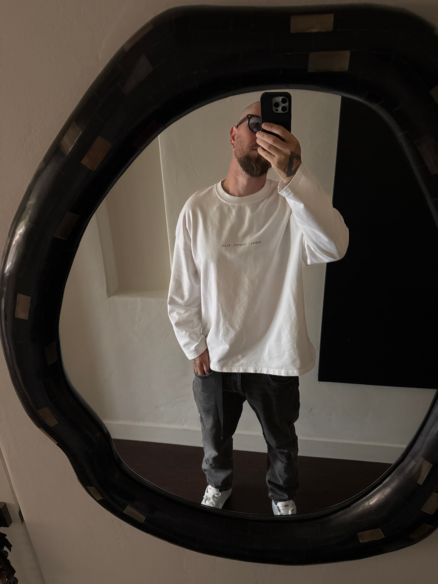 An adult male is captured in a mirror selfie within an indoor setting in Los Angeles, California, United States of America. The subject is bald with a full, trimmed beard and wears dark-rimmed glasses…read more
