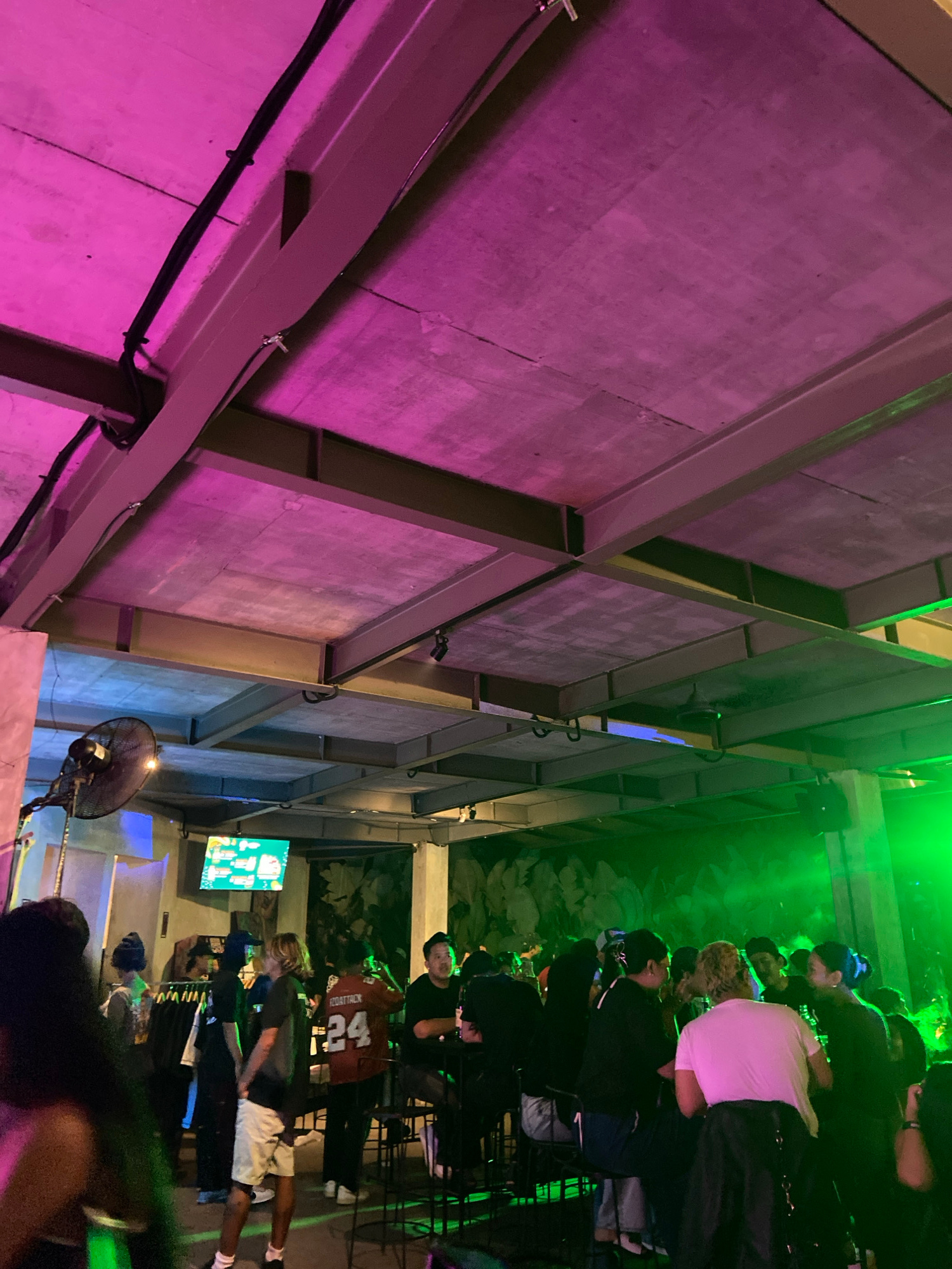 The image shows a gathering of people in an outdoor bar or restaurant in Denpasar, Indonesia. The setting is illuminated by colorful lighting, with a distinctive pink hue on the left side and green on…read more
