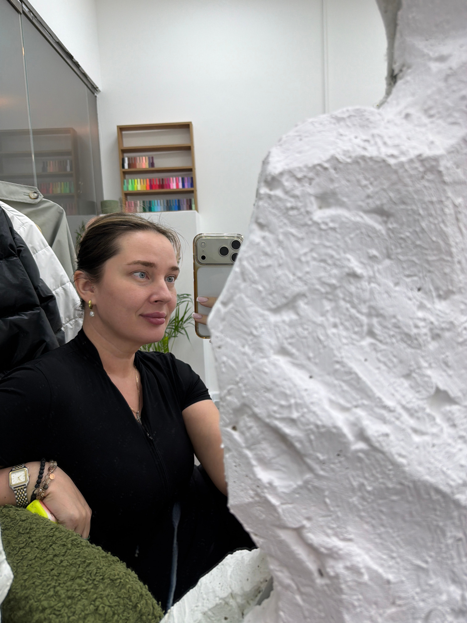 A woman is taking a selfie in a room. She is holding a phone in her right hand, and her face is visible in the frame. The background includes a white wall, a shelf with colorful items, and a mirror. T…read more