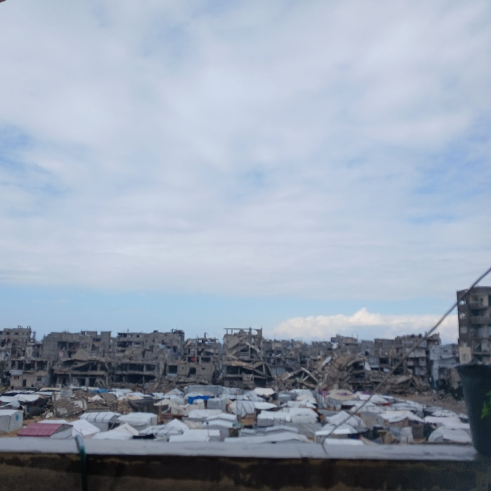 This image captures an elevated, panoramic view of an extensively damaged urban area in the city of Gaza, Palestinian Territory, beneath a partly cloudy sky. In the immediate foreground, a dark, out-…read more