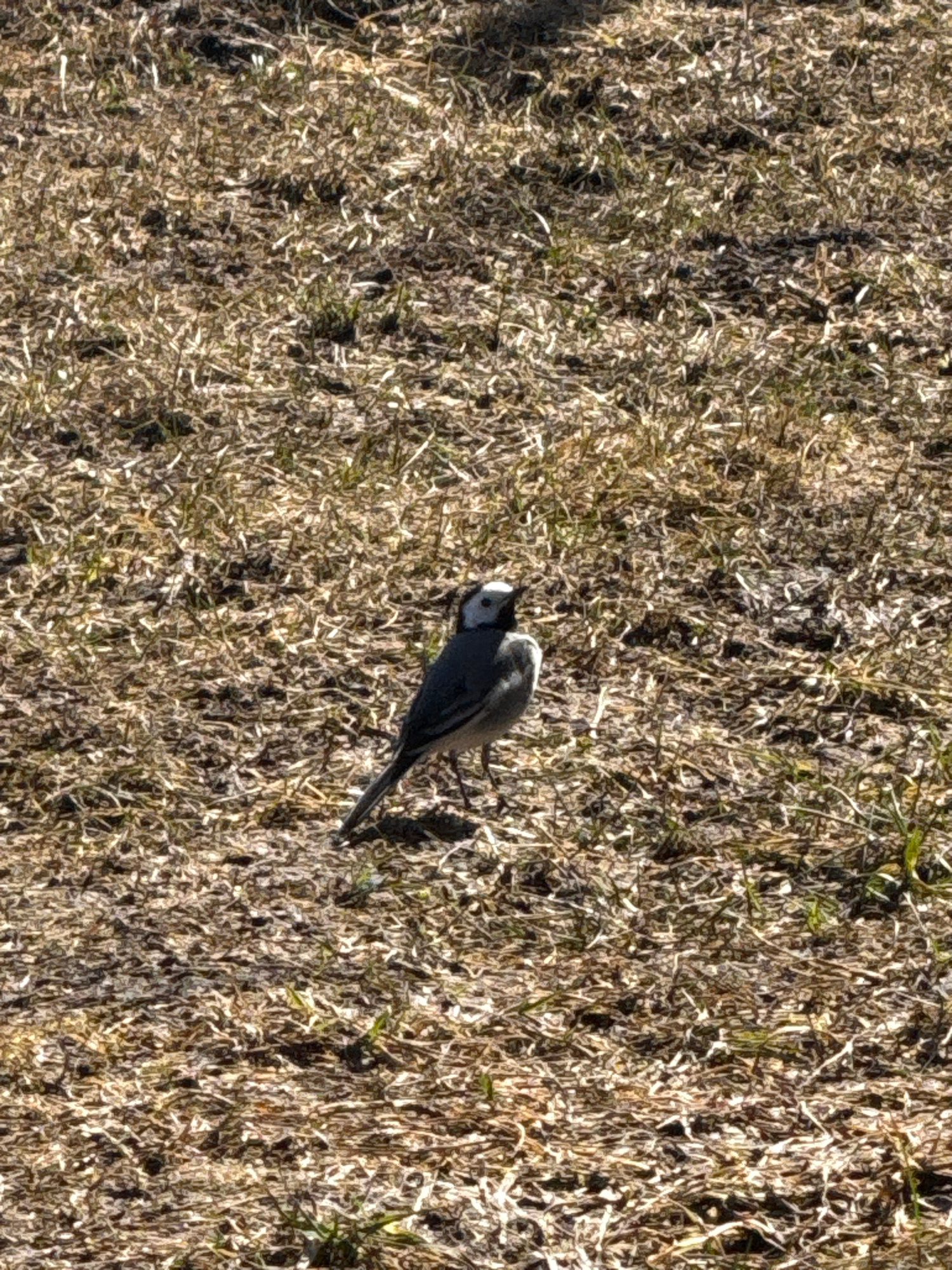 The image depicts a white wagtail bird perched in dry, brown grass. The bird is oriented diagonally in the frame. The location is Tyulyuk, Russia.