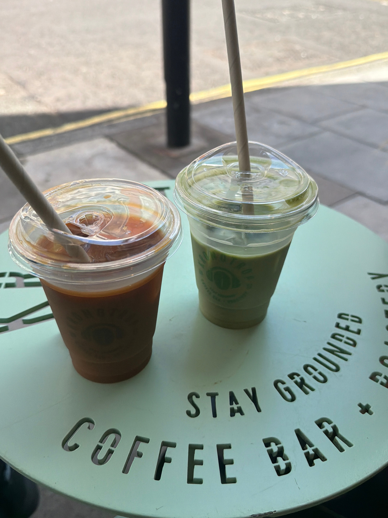 The image shows two takeaway drinks on a pale green table with the words "STAY GROUNDED + COFFEE BAR" cut out of the table surface. One drink is a green-colored beverage, possibly matcha, and the othe…read more