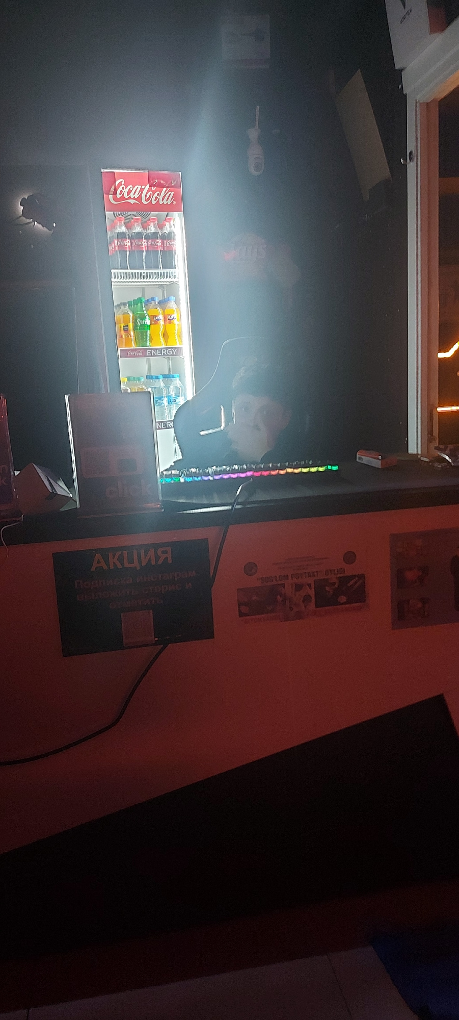 The image shows a man's reflection in a brightly lit Coca-Cola vending machine. The machine contains rows of Coca-Cola, Fanta, Sprite, and energy drinks. Next to the machine is a black sign with white…read more