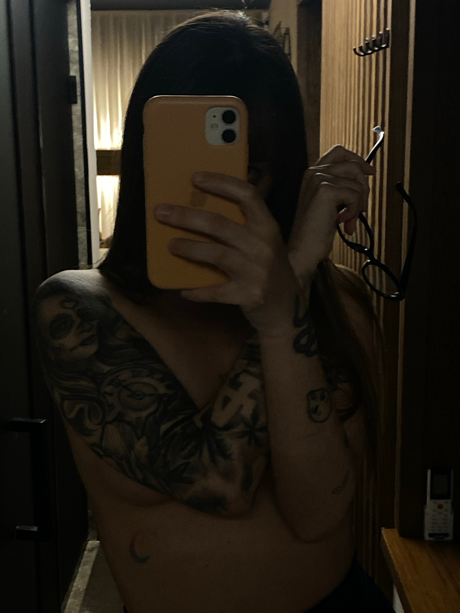 A person with long, dark hair is taking a selfie with an orange-colored smartphone. The person is holding a pair of black-rimmed glasses in their other hand. The person's arms are crossed, revealing t…read more