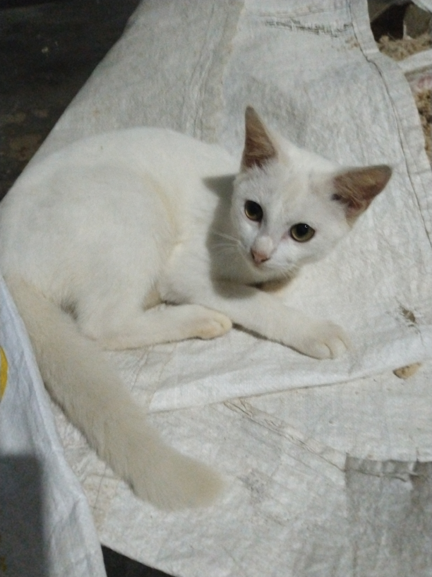 A white cat is lying on a white cloth surface. The cat has golden eyes and light brown ears. The background is dark, suggesting the scene is indoors. The location is Unknown, Unknown.